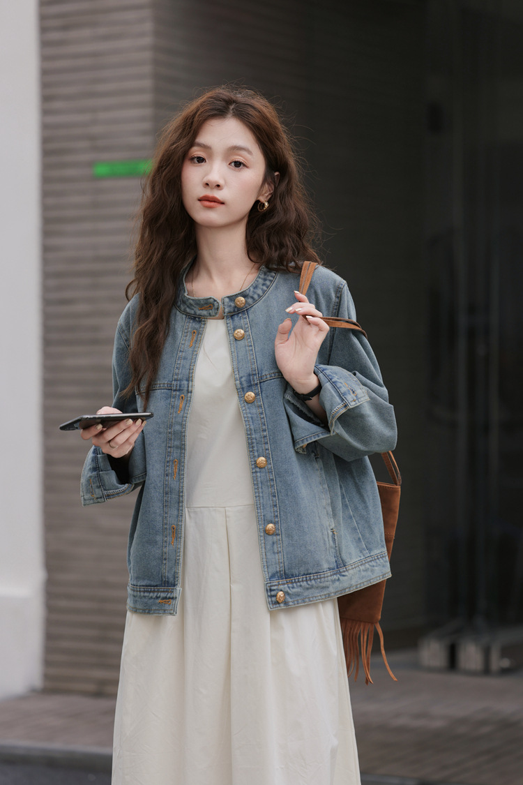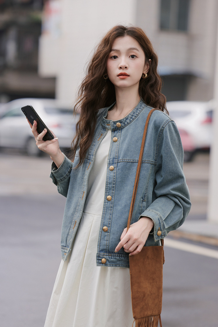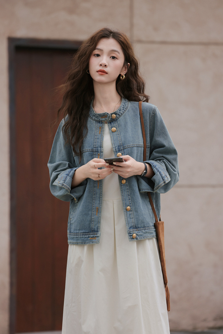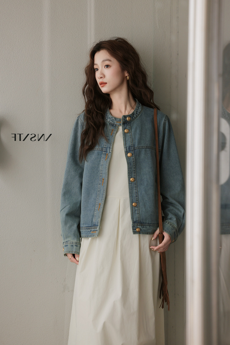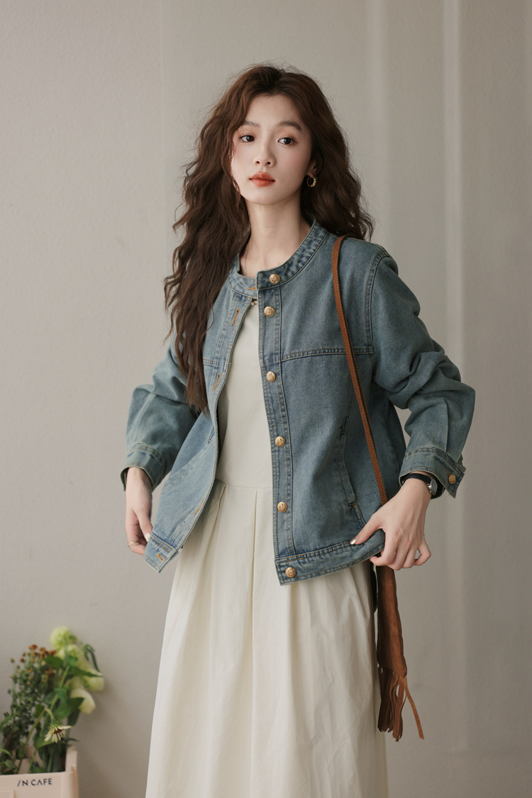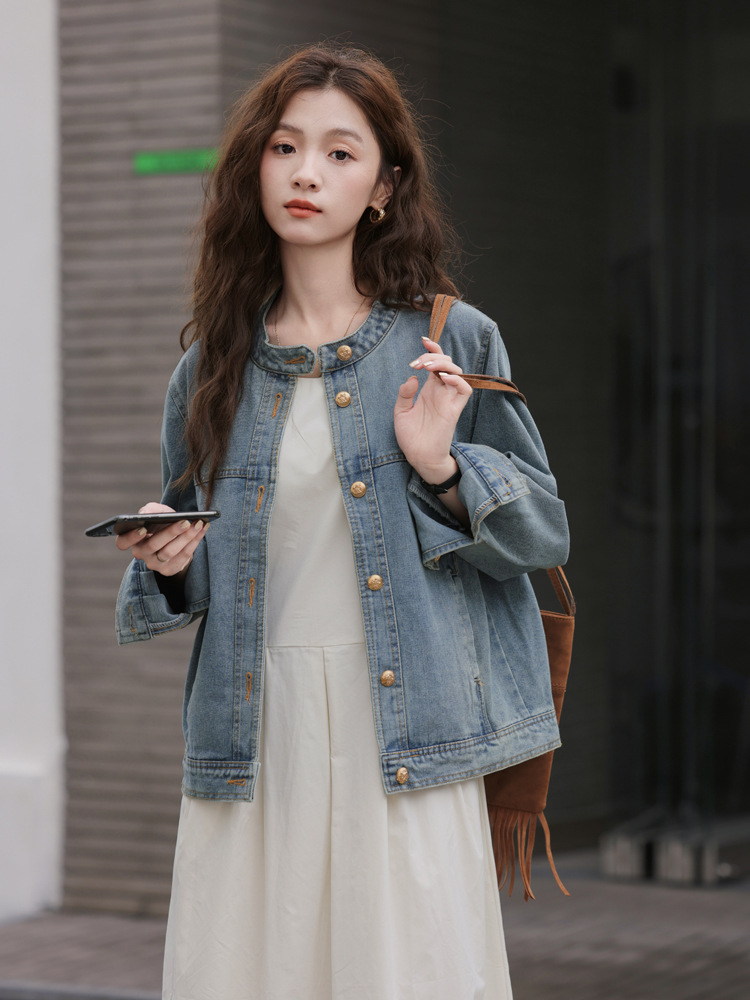 빈티지 틈새 크루 넥 데님 재킷 여성 2024 가을 새로운 느슨한 디자인 센스 싱글 브레스트 긴팔 재킷 탑스토어 가기