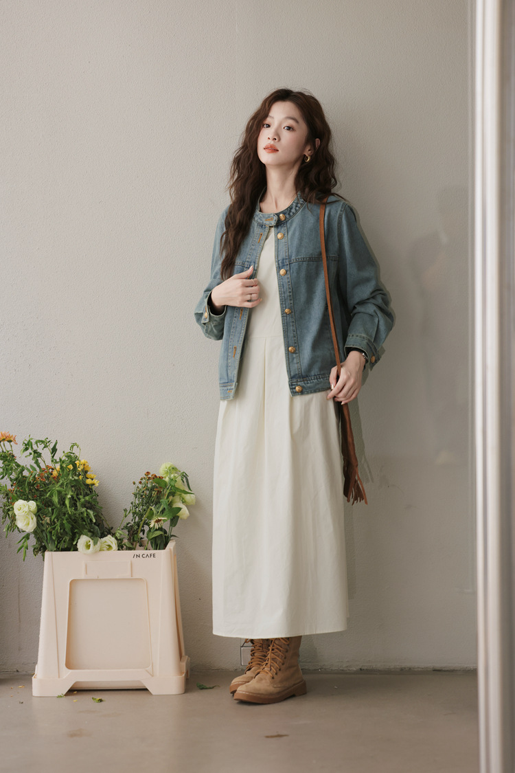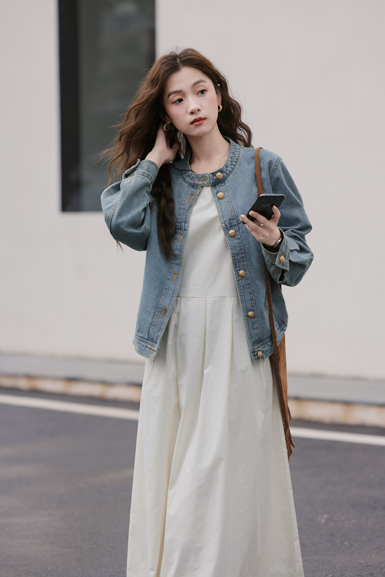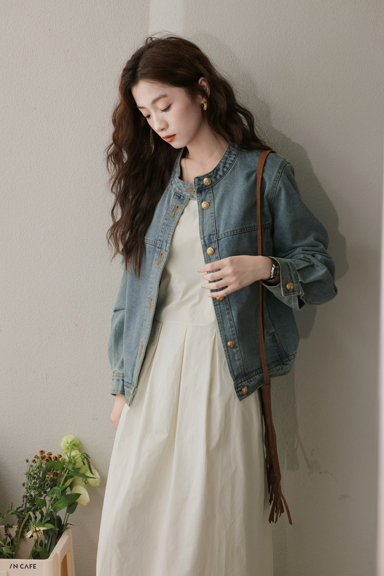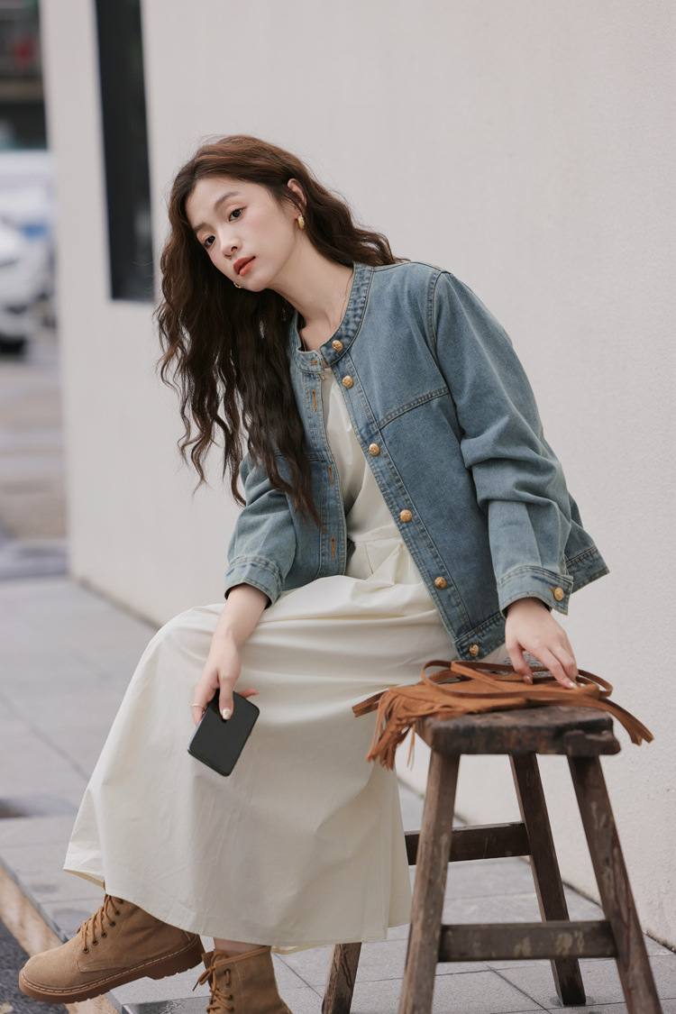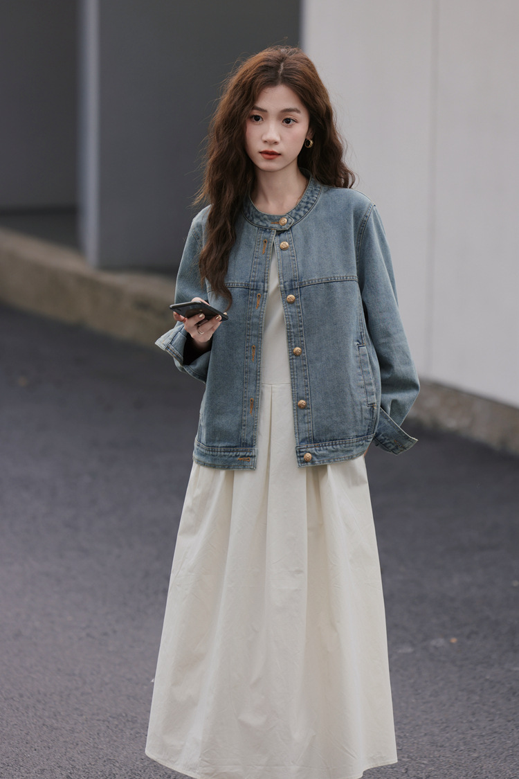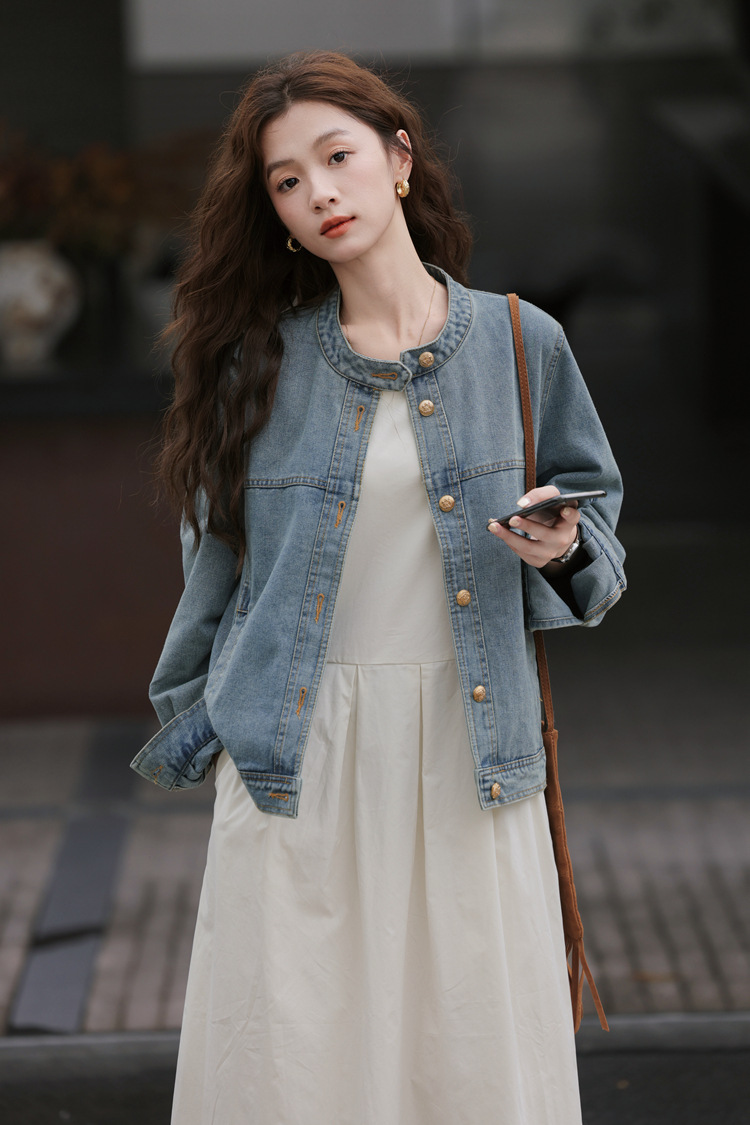 빈티지 틈새 크루 넥 데님 재킷 여성 2024 가을 새로운 느슨한 디자인 센스 싱글 브레스트 긴팔 재킷 탑스토어 가기