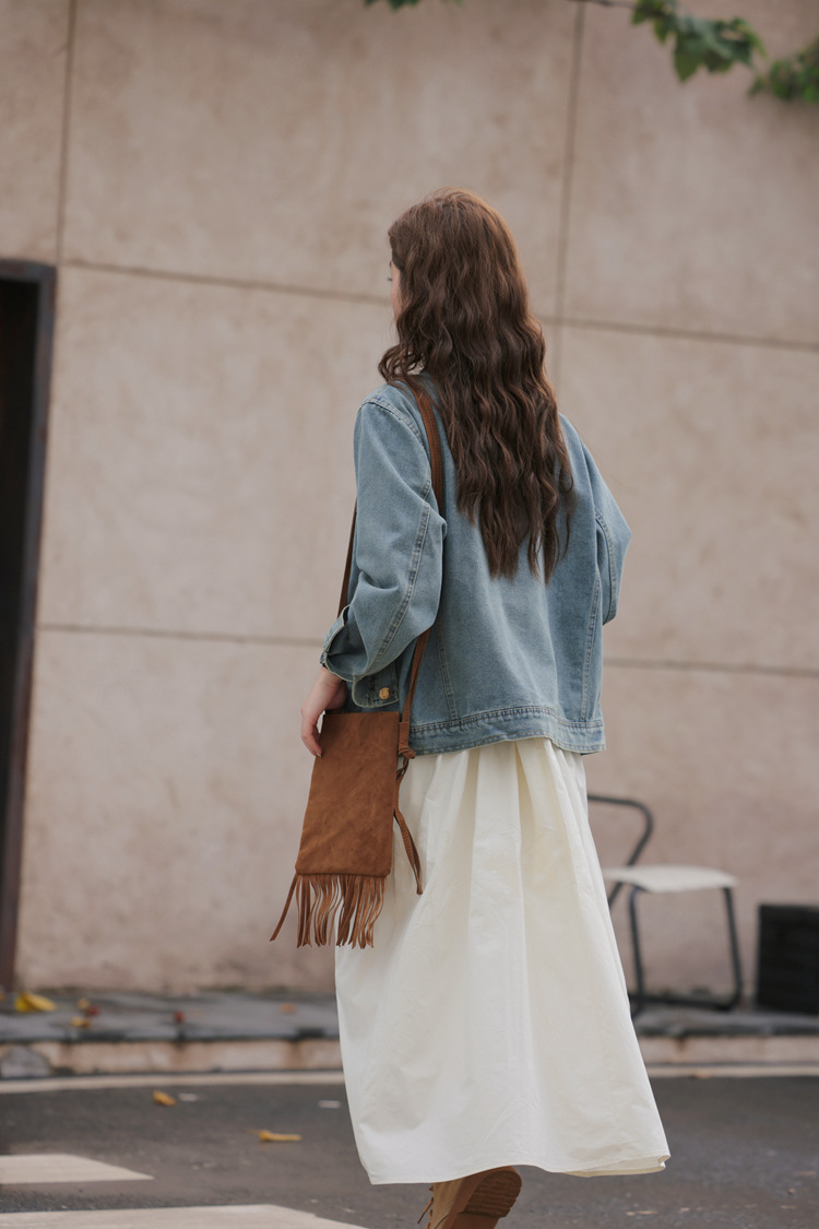 빈티지 틈새 크루 넥 데님 재킷 여성 2024 가을 새로운 느슨한 디자인 센스 싱글 브레스트 긴팔 재킷 탑