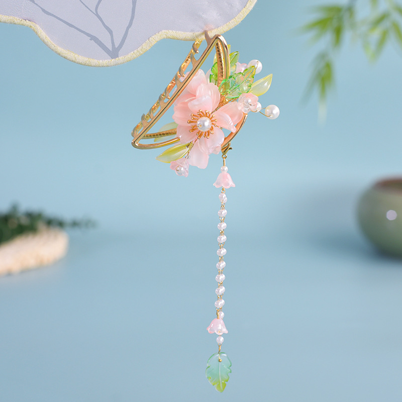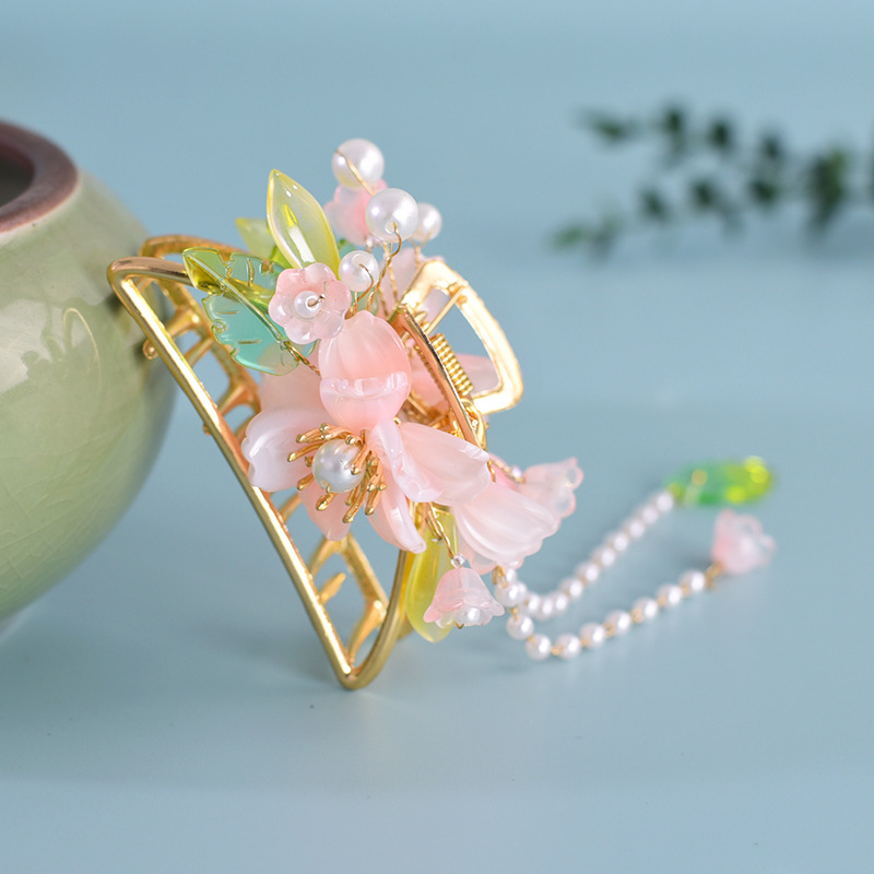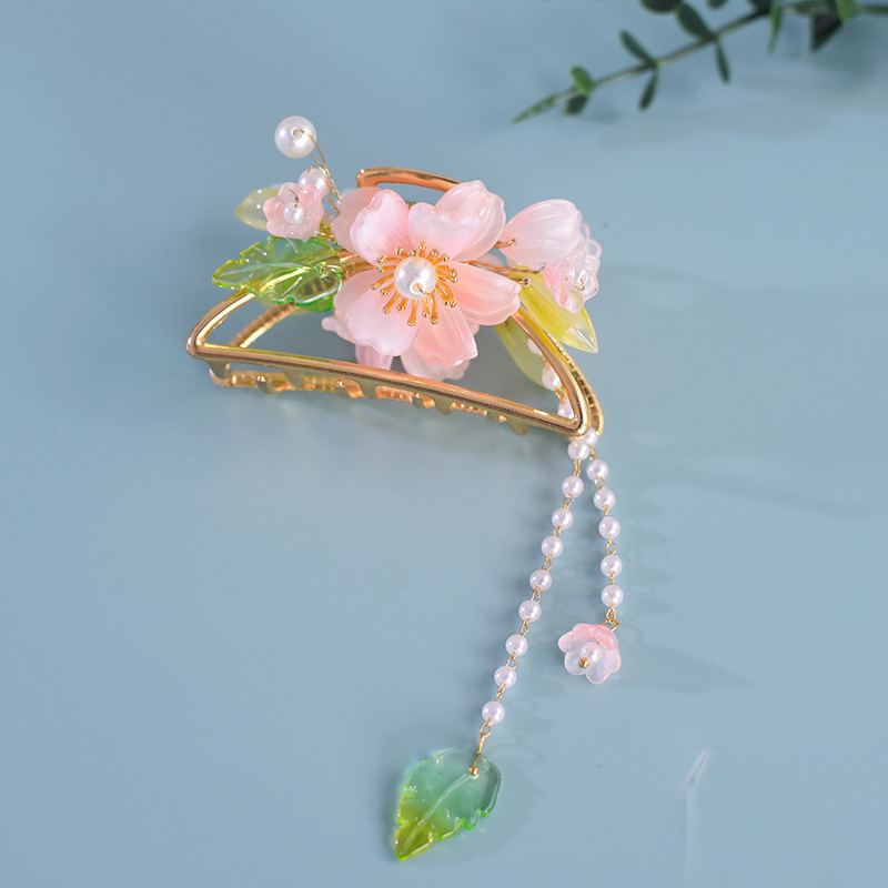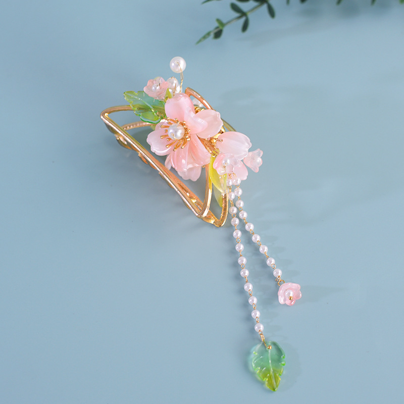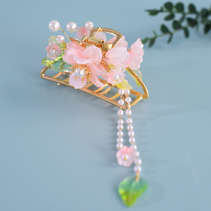 새로운 중국 스타일의 요정 진주 핑크 헤드웨어 복숭아 꽃 그립 여성용 하이 엔드 센스 백 헤드 상어 클립 Guofeng 헤어핀