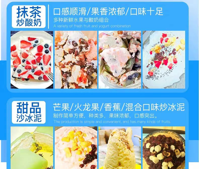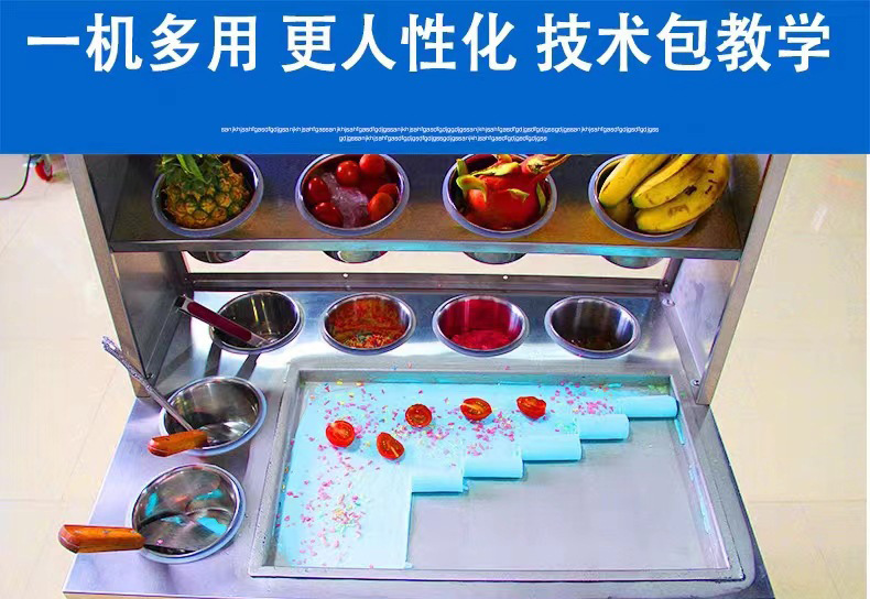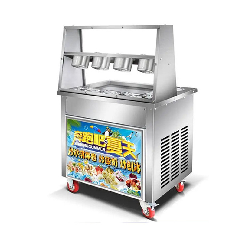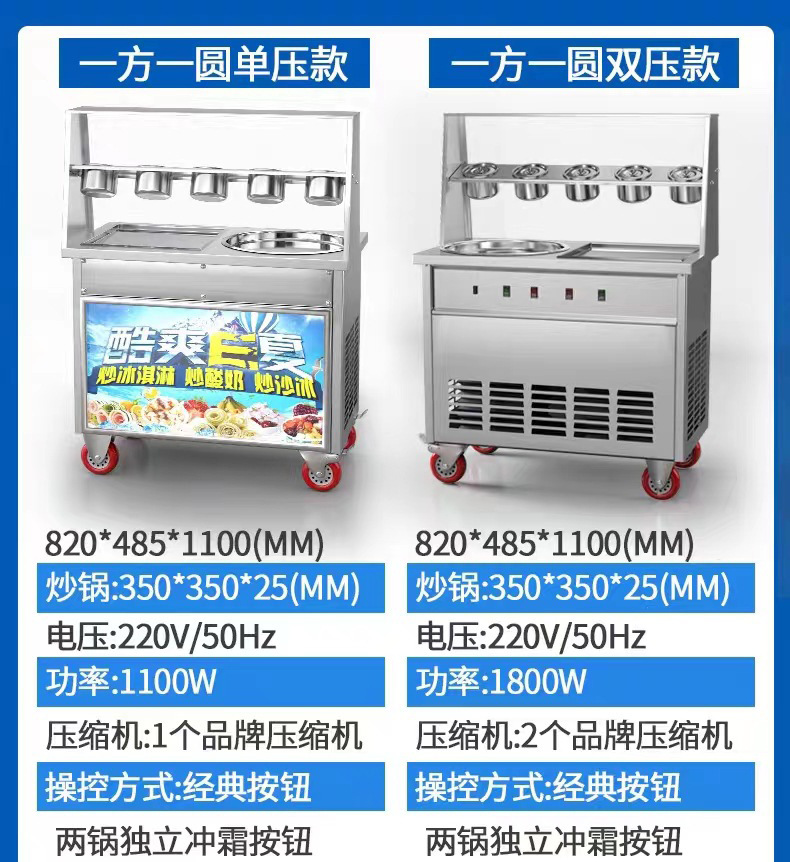 상업용 완전 자동 얼음 튀김 기계 단일 및 이중 냄비 두꺼운 절단 및 튀김 요구르트 특수 기계 튀김 용 우유 과일 아이스크림 롤