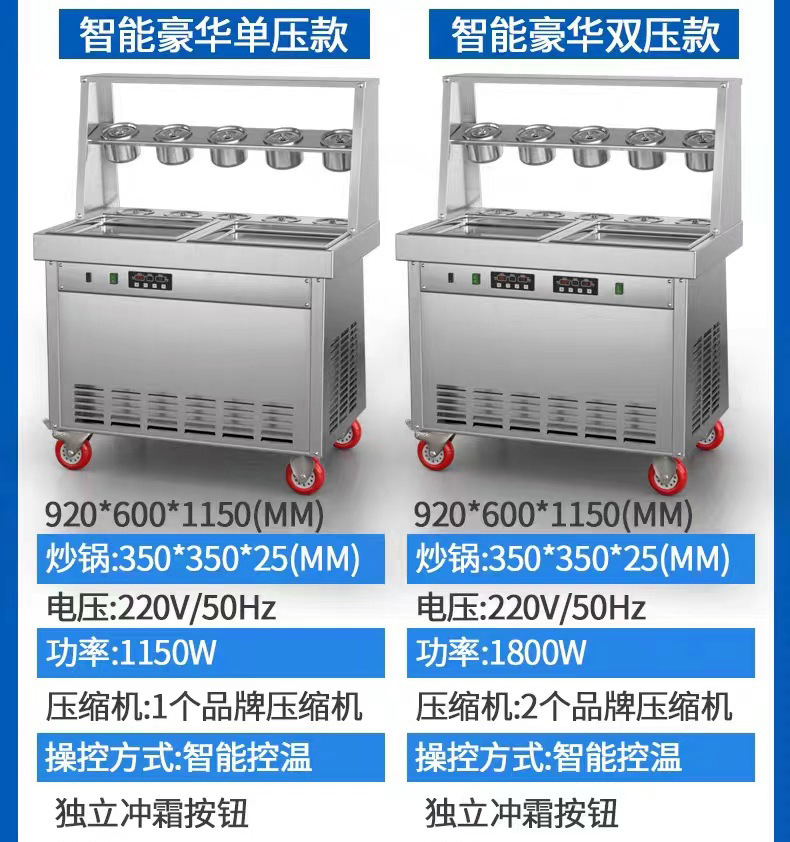 상업용 완전 자동 얼음 튀김 기계 단일 및 이중 냄비 두꺼운 절단 및 튀김 요구르트 특수 기계 튀김 용 우유 과일 아이스크림 롤스토어 가기