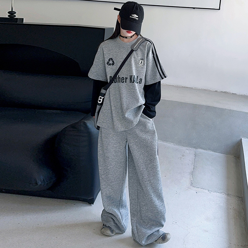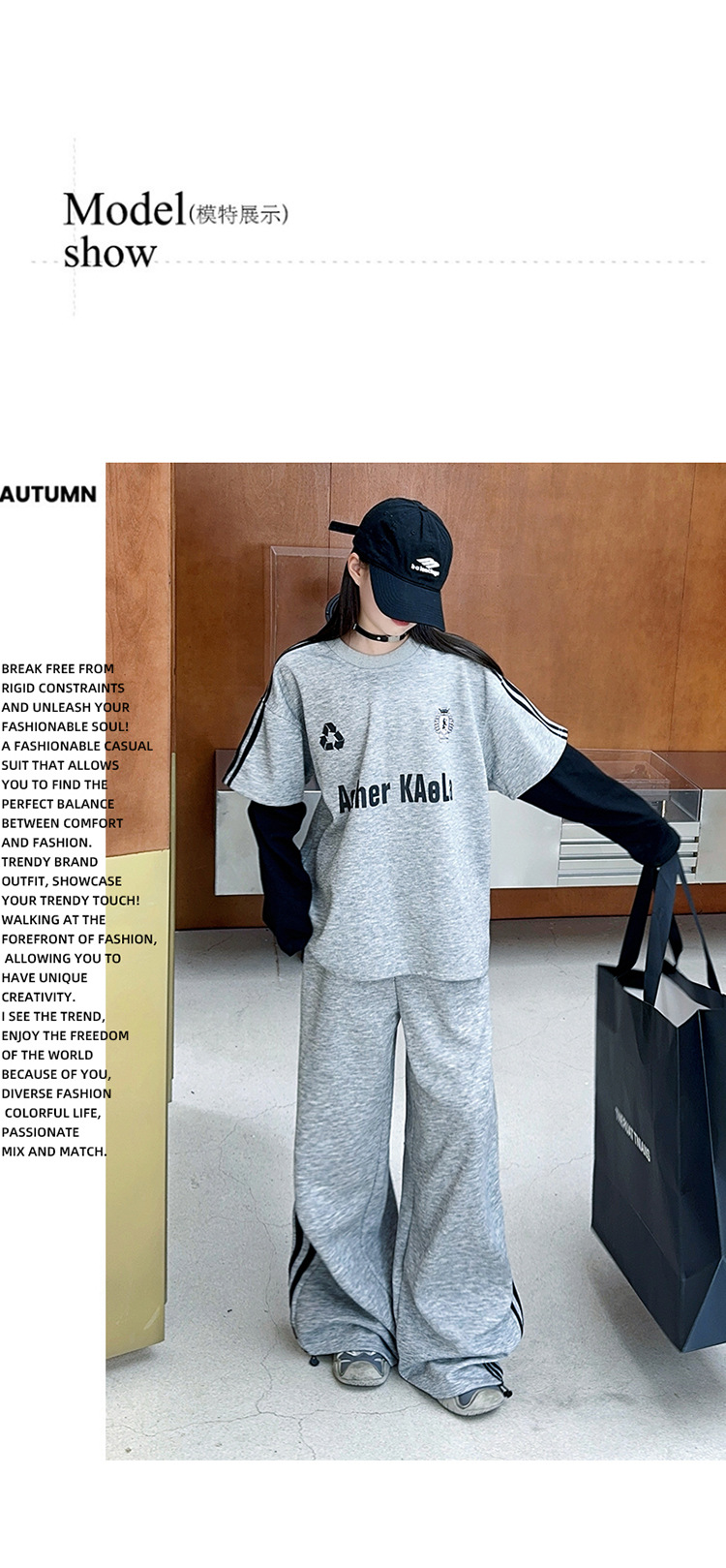 소녀 세트 봄과 가을 새로운 어린이 유행 편지 인쇄 가짜 투피스 티셔츠 넓은 다리 바지 스포츠 투피스 세트