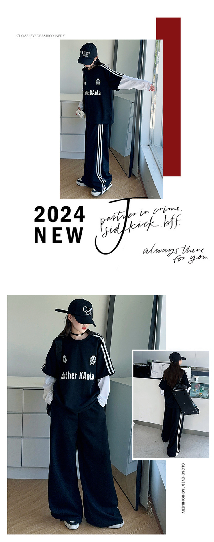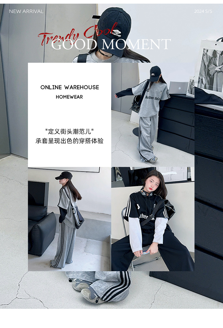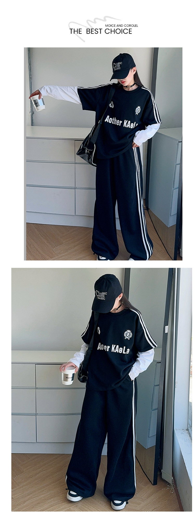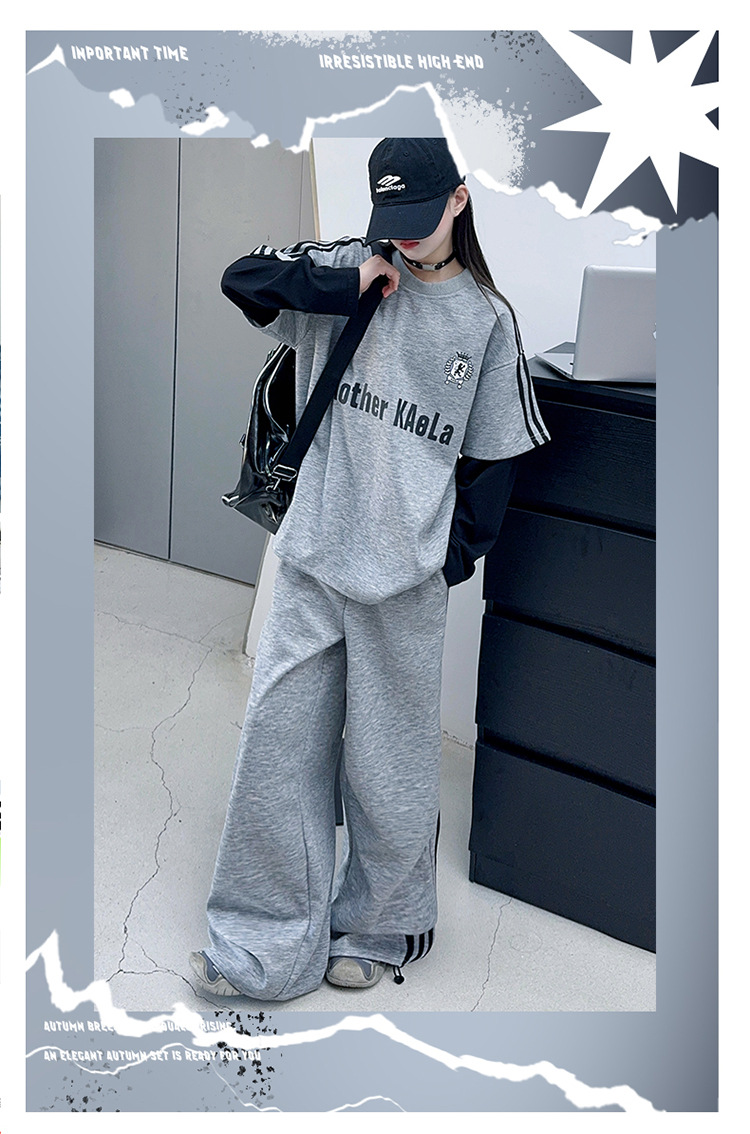 소녀 세트 봄과 가을 새로운 어린이 유행 편지 인쇄 가짜 투피스 티셔츠 넓은 다리 바지 스포츠 투피스 세트스토어 가기