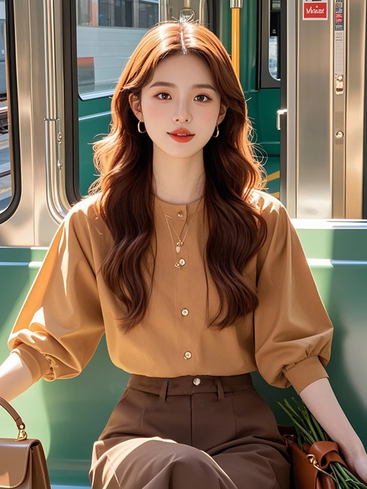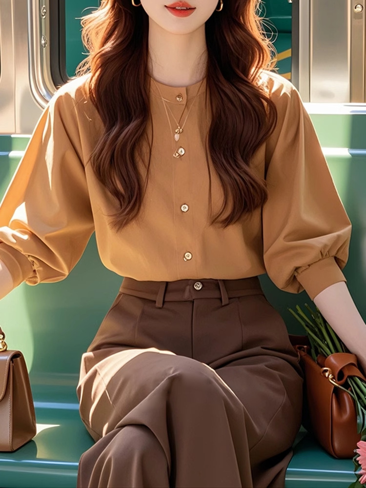 가을은 하이 엔드 여성 패션 전문 작은 향기로운 스타일 다크 브라운 셔츠 넓은 다리 바지 세트 패션을 착용합니다.