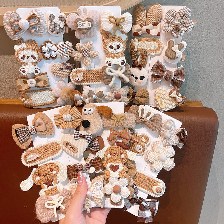 어린이 가을과 겨울 라이트 베이지 직물 니트 머리핀 어린이 귀여운 깨진 머리 앞머리 클립 어린 소녀 만화 헤어 액세서리 배치