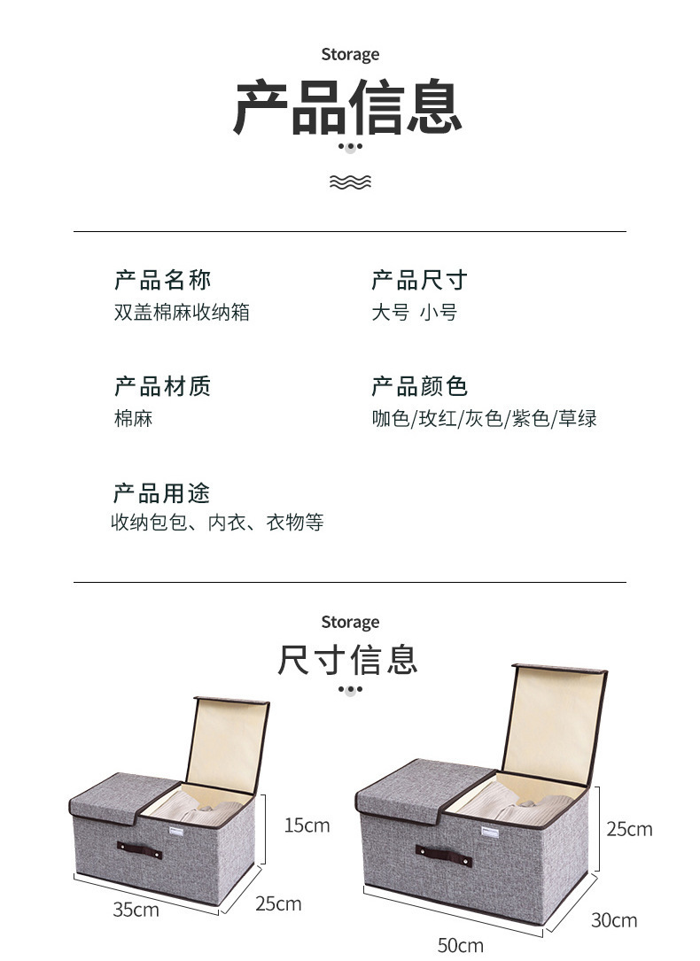 면 및 린넨 더블 뚜껑 보관 상자 하위 형식 접이식 직물 의류 보관 상자 홈 옷장 보관 상자 도매스토어 가기