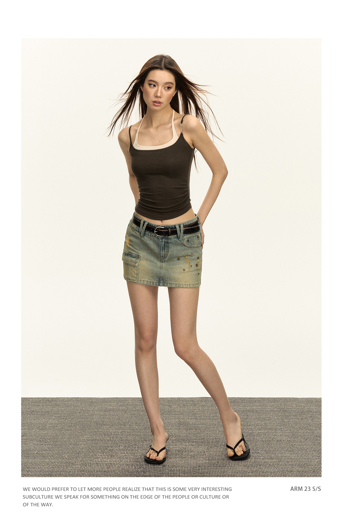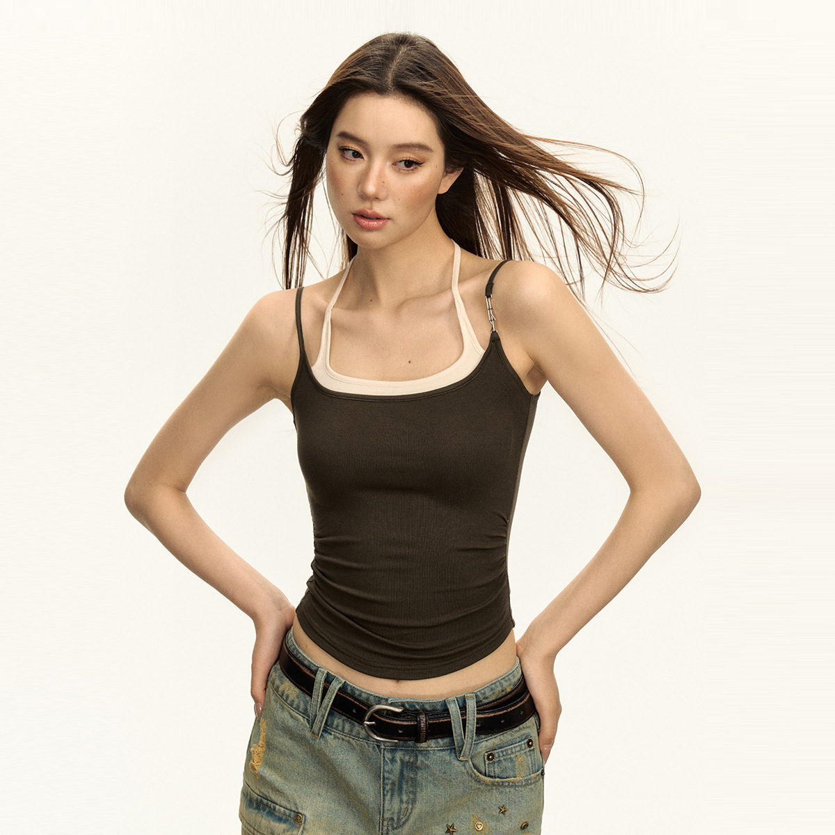 2024 여름 현악 스파이스 소녀 스타일 슬링 티셔츠 여성용 작은 하이 스트리트 미국 허리 가짜 투피스 짧은 조끼