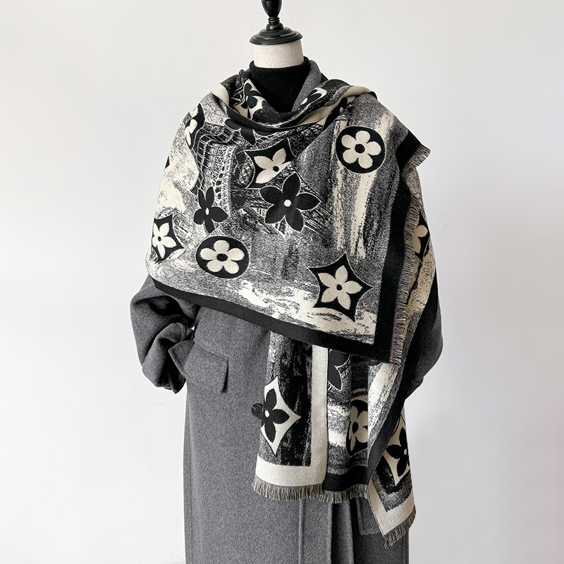 2024 가을과 겨울 새로운 모조 캐시미어 파리 타워 빈티지 다섯개 별 인쇄 양면 따뜻한 스카프 목도리