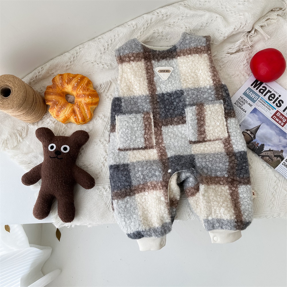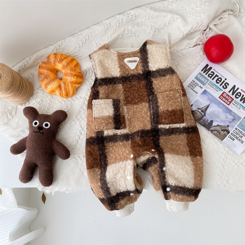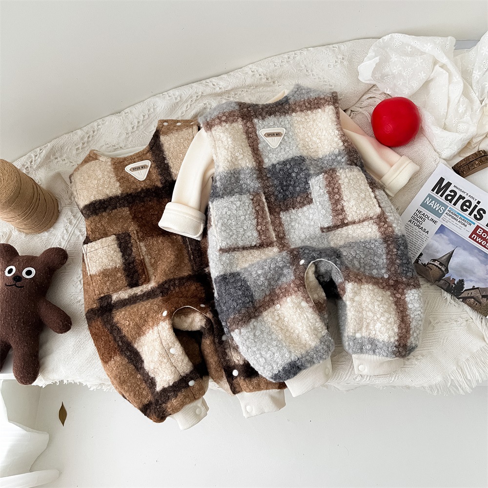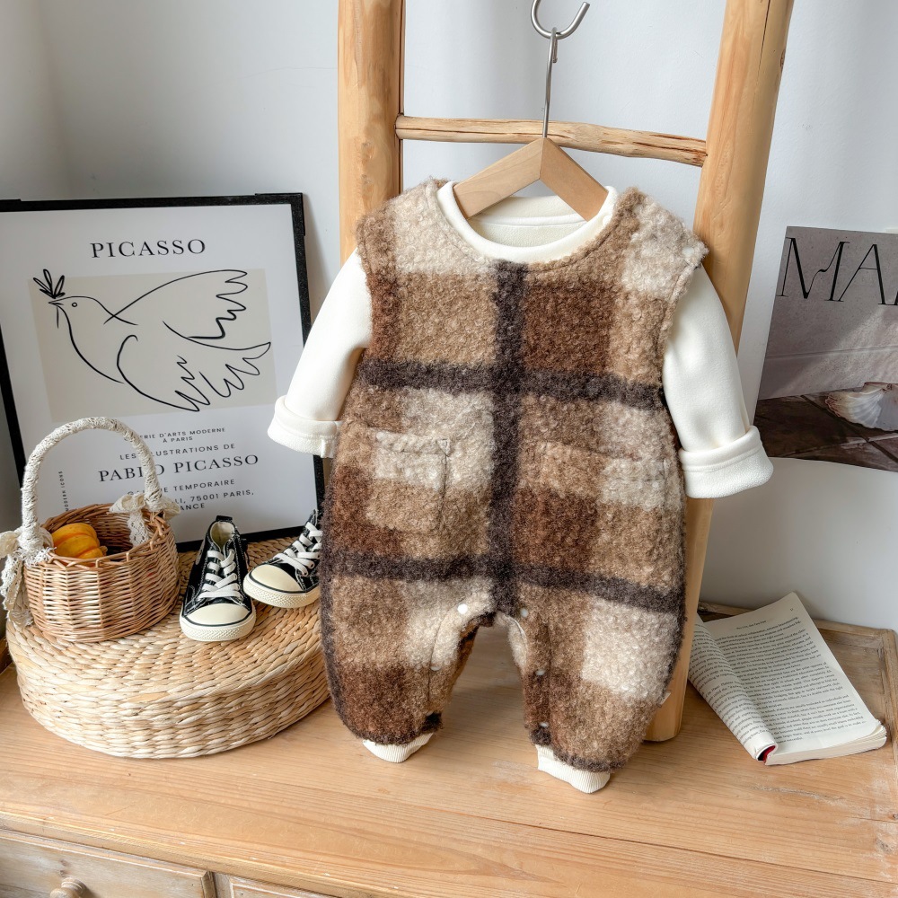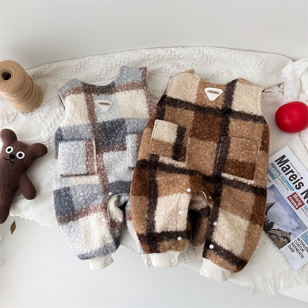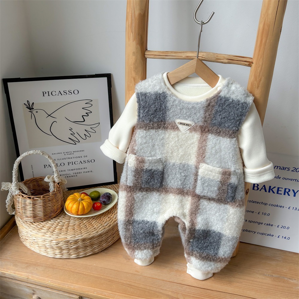 2025년 늦가을 아기복 세트 한국 스타일 레트로 체크 플러스 벨벳 롬퍼 투피스 세트 아기 초겨울 원피스 세트스토어 가기