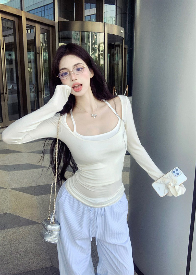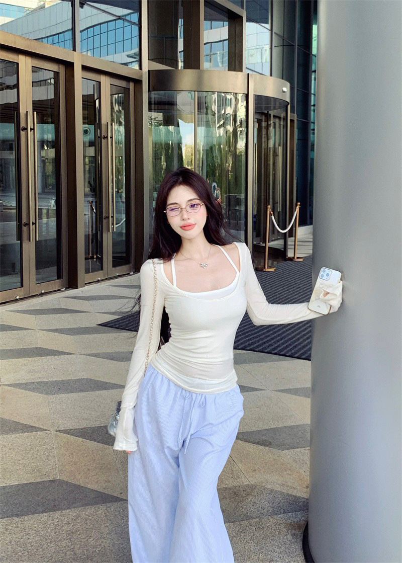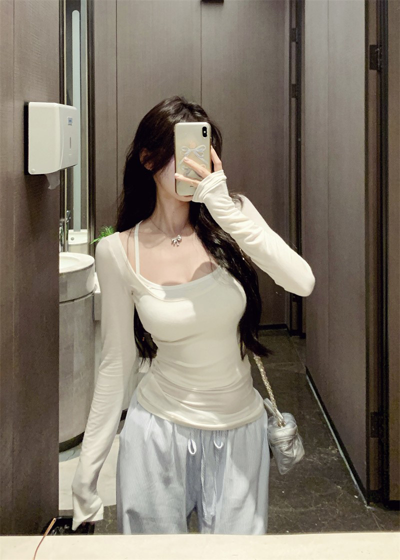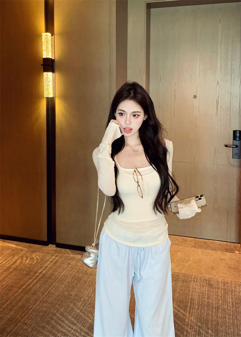 한국식 슬림핏 섹시 마이크로 투명 긴팔 티셔츠 여성 초가을 꽉 끼는 슬리밍 기본 올 매치 솔리드 컬러베이스 셔츠 탑