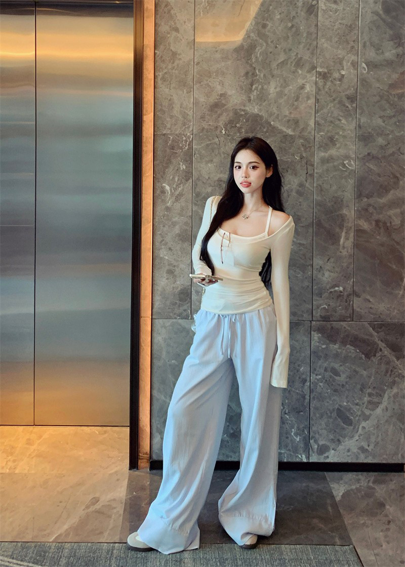 • 화이트 멜빵 + 살구 블라우스 [투피스 세트]