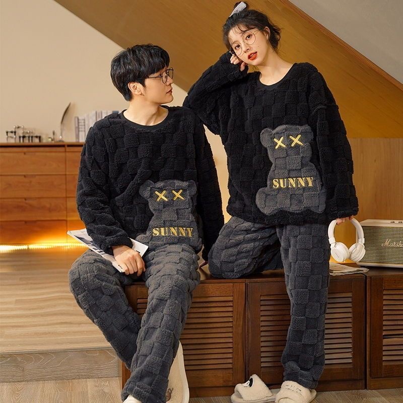 커플 잠옷 여성의 겨울 플란넬 두꺼운 둥근 목 귀여운 한국 산호 양털 따뜻한 남자 캐주얼 홈 옷