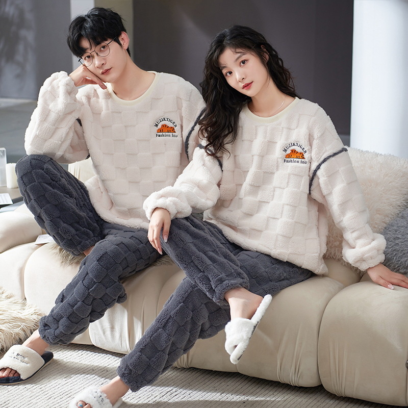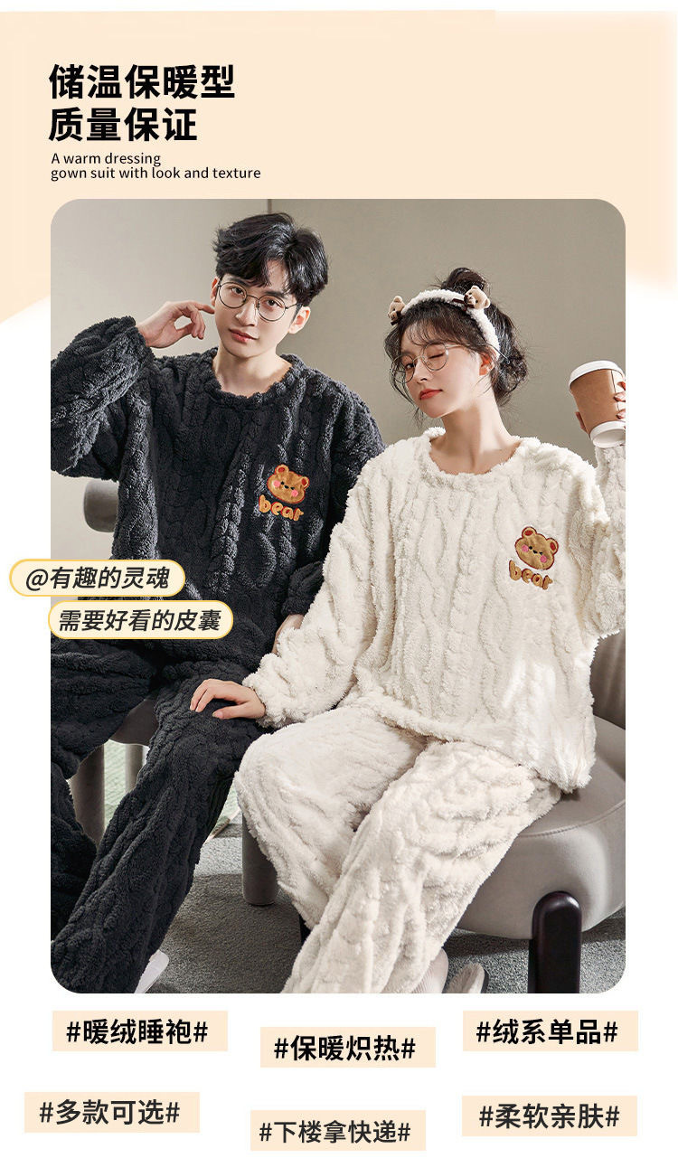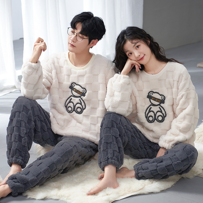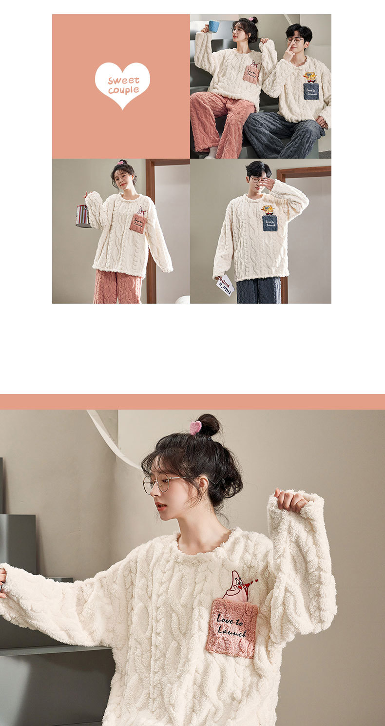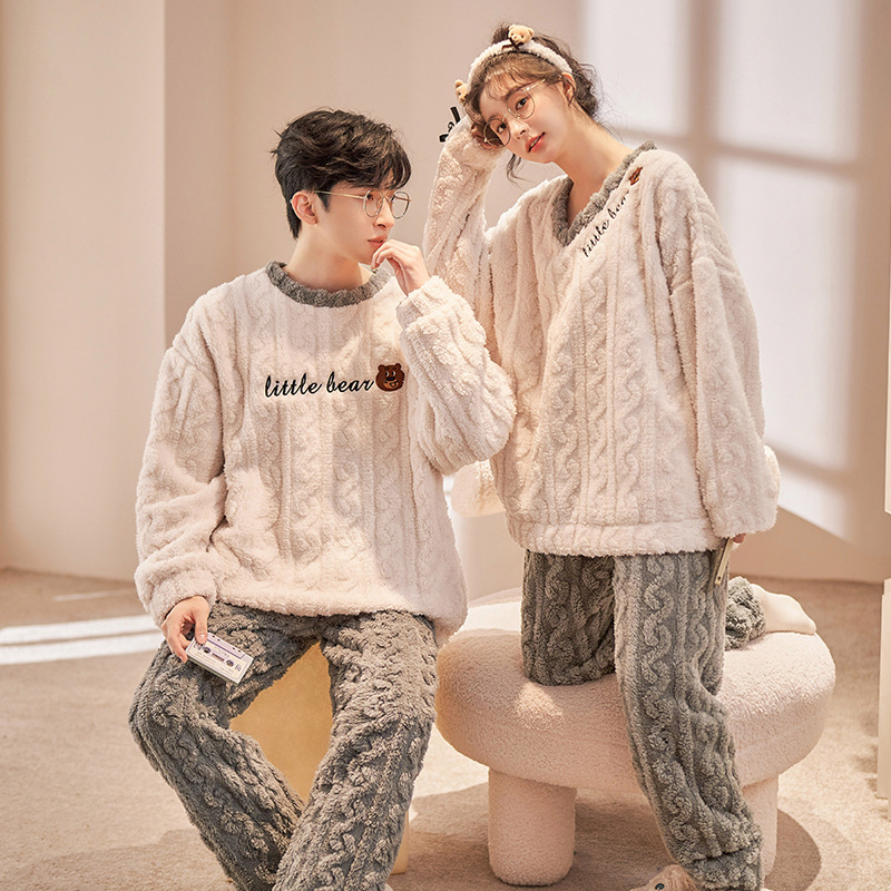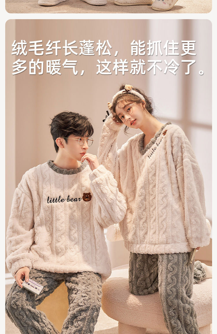 커플 잠옷 여성의 겨울 플란넬 두꺼운 둥근 목 귀여운 한국 산호 양털 따뜻한 남자 캐주얼 홈 옷스토어 가기
