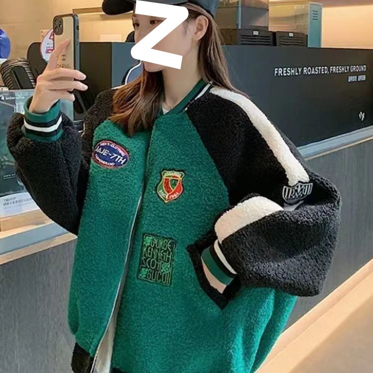 두꺼운 양고기 양모 코트 여성 유럽 역 2024 가을과 겨울 새로운 느슨한 플러스 사이즈 야구 옷을 학생 재킷에 넣습니다.