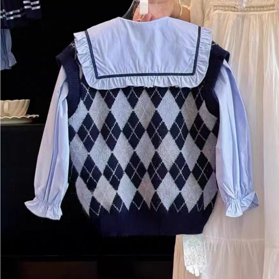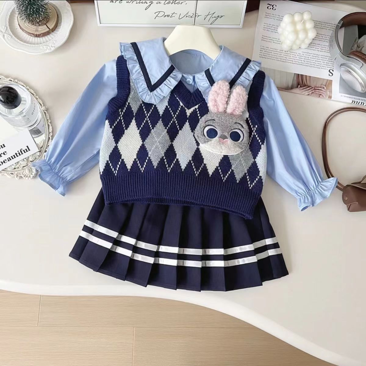 소녀 토끼 경찰관 가을 아카데미 스타일 세트 2024 새로운 어린이 JK 주름 치마 소녀 조끼 3 피스 세트스토어 가기