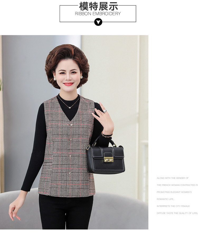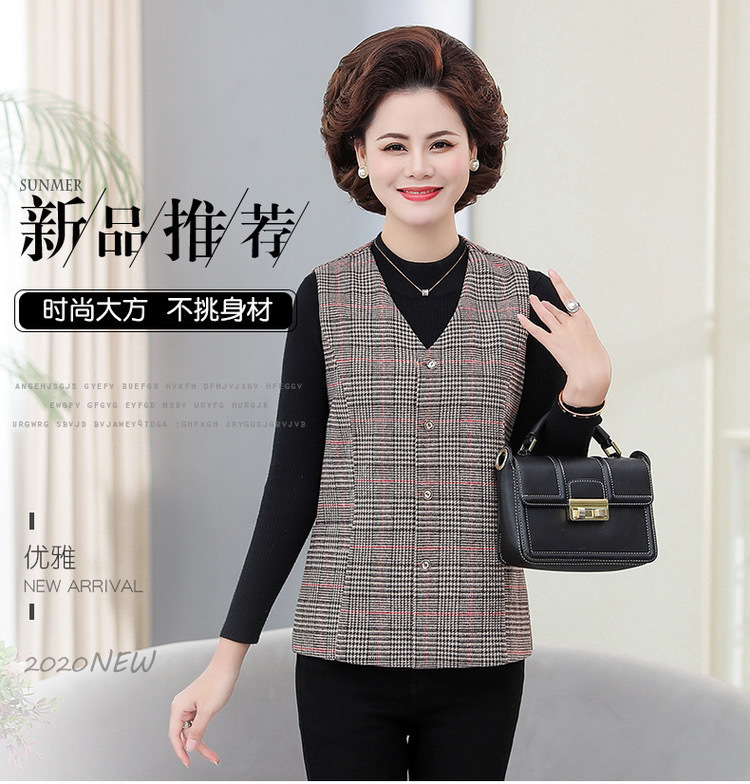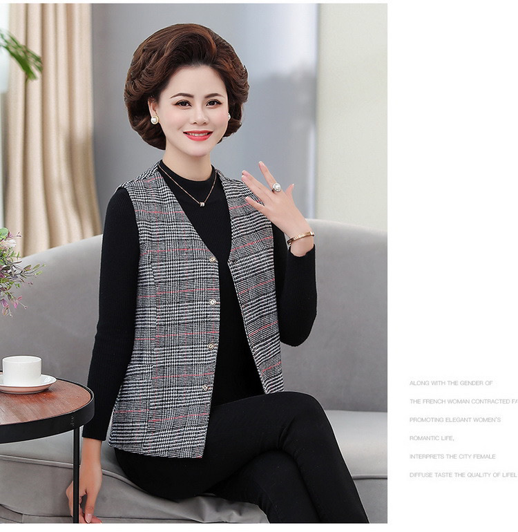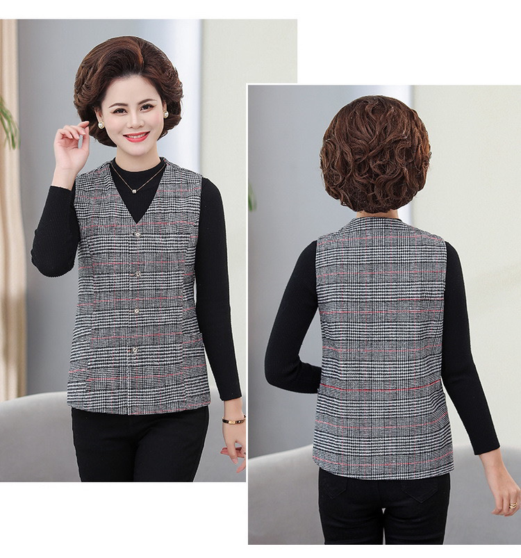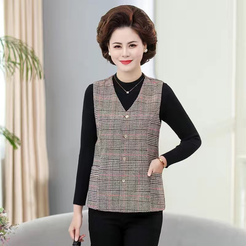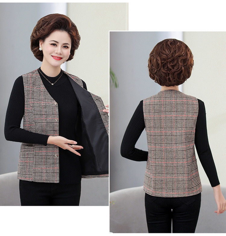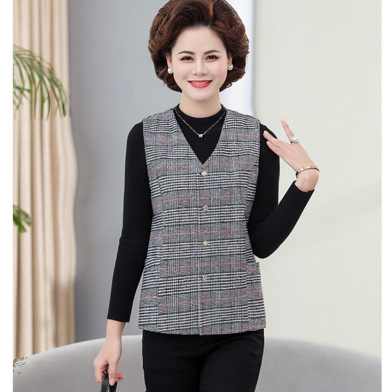 봄과 가을 중년 조끼 여성의 짧은 느슨한 플러스 사이즈 어머니의 격자 무늬 조끼 노인을위한 얇은 조끼