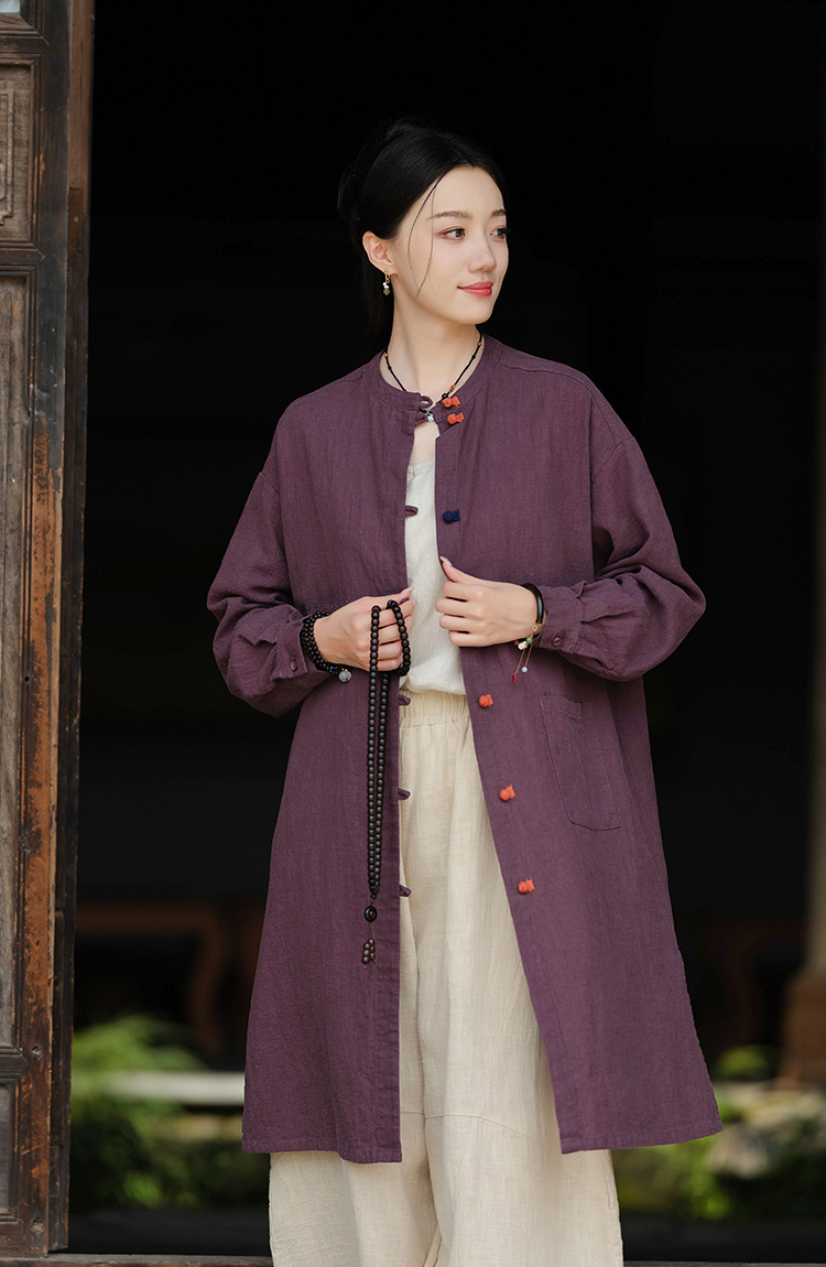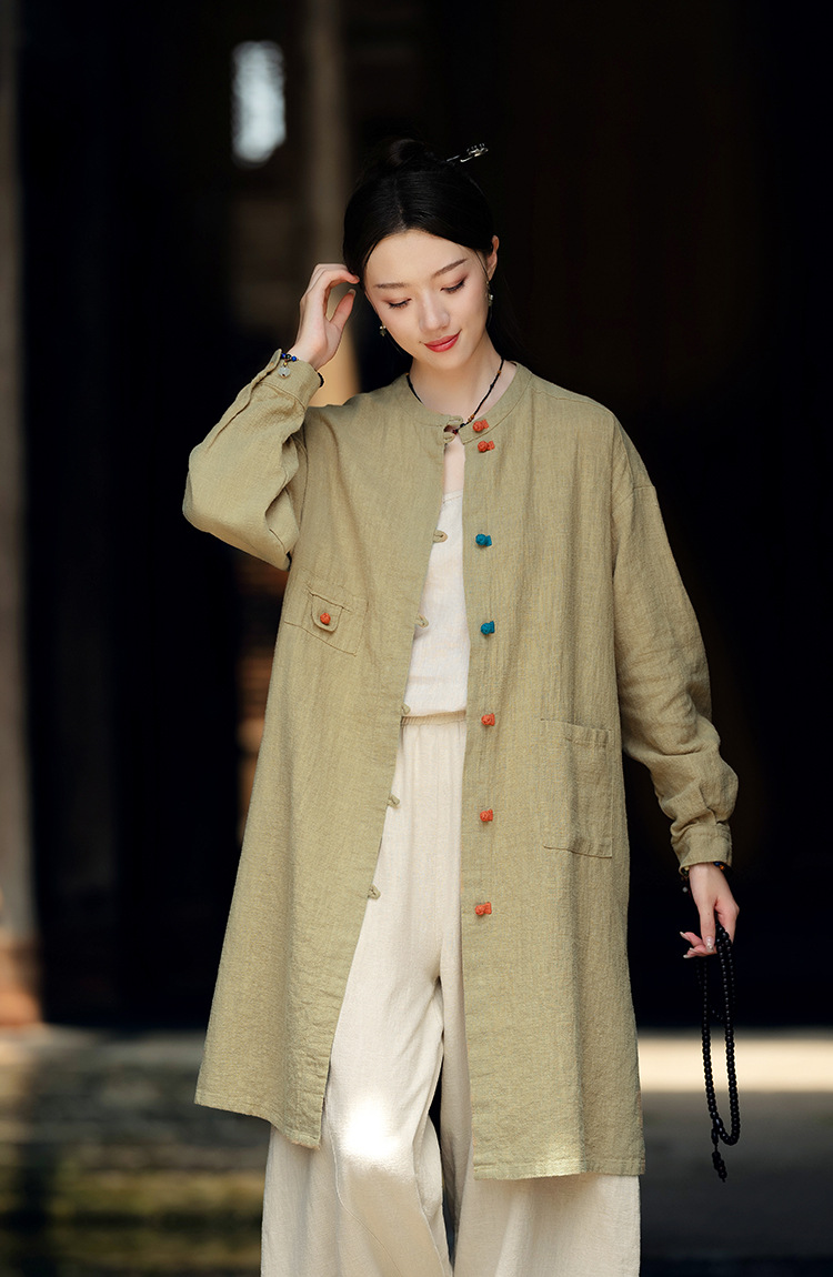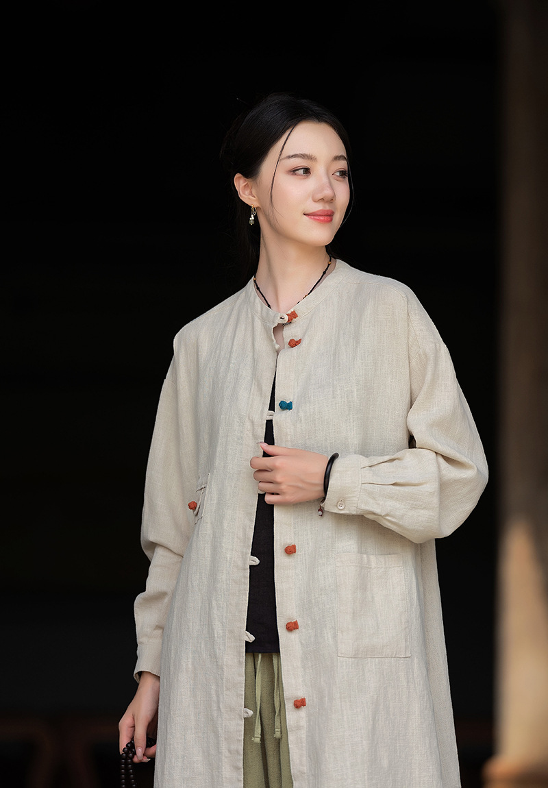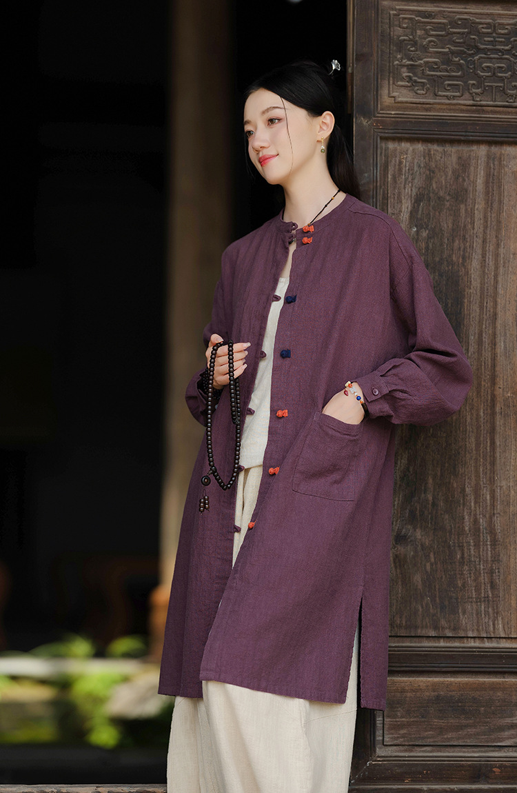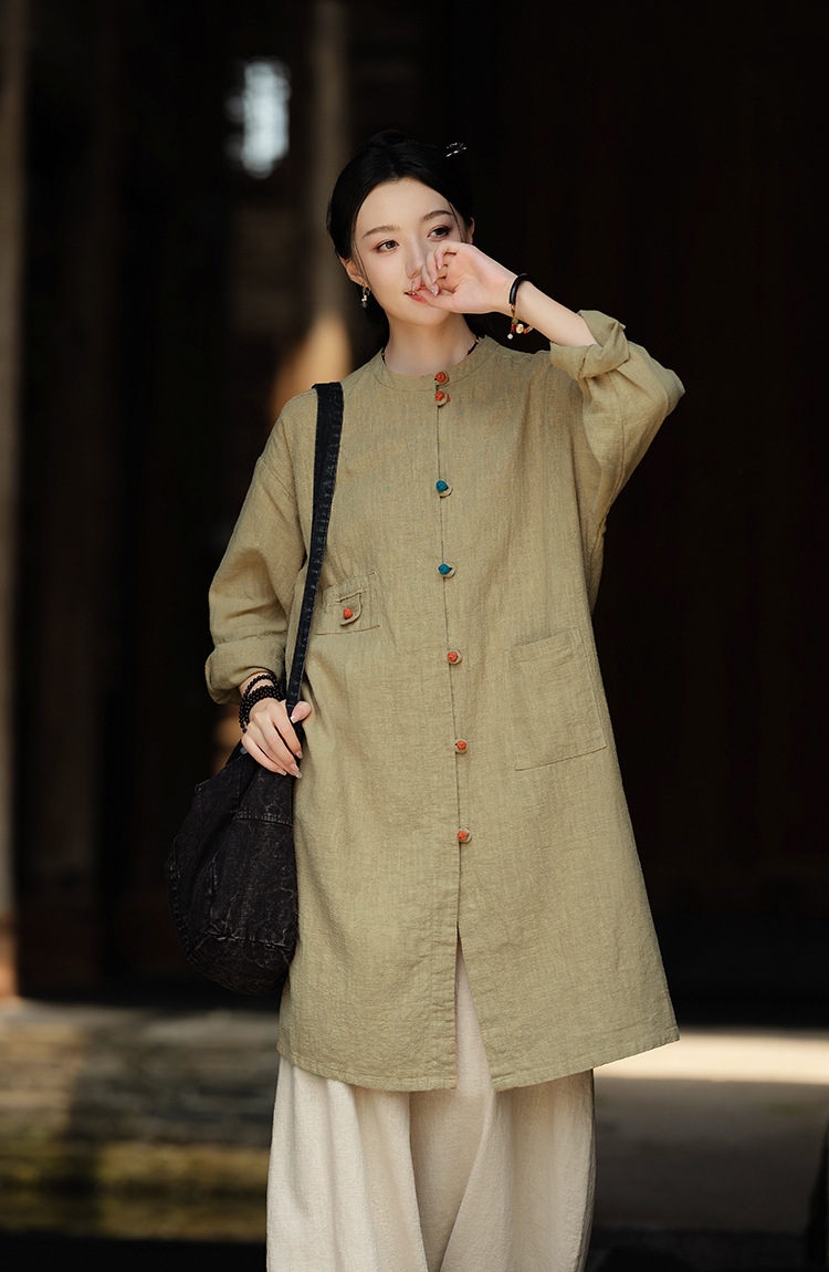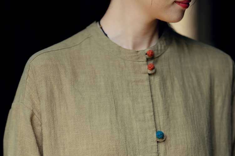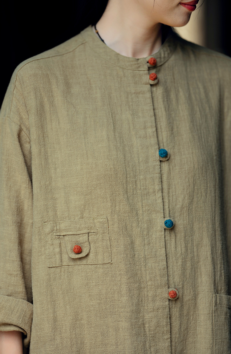 25면마 혼방 여성복 신상품, 예술적 레트로 스타일의 스탠드 칼라 배색 단추 자켓, 샌드워시 면마 셔츠 여성용 가디건스토어 가기