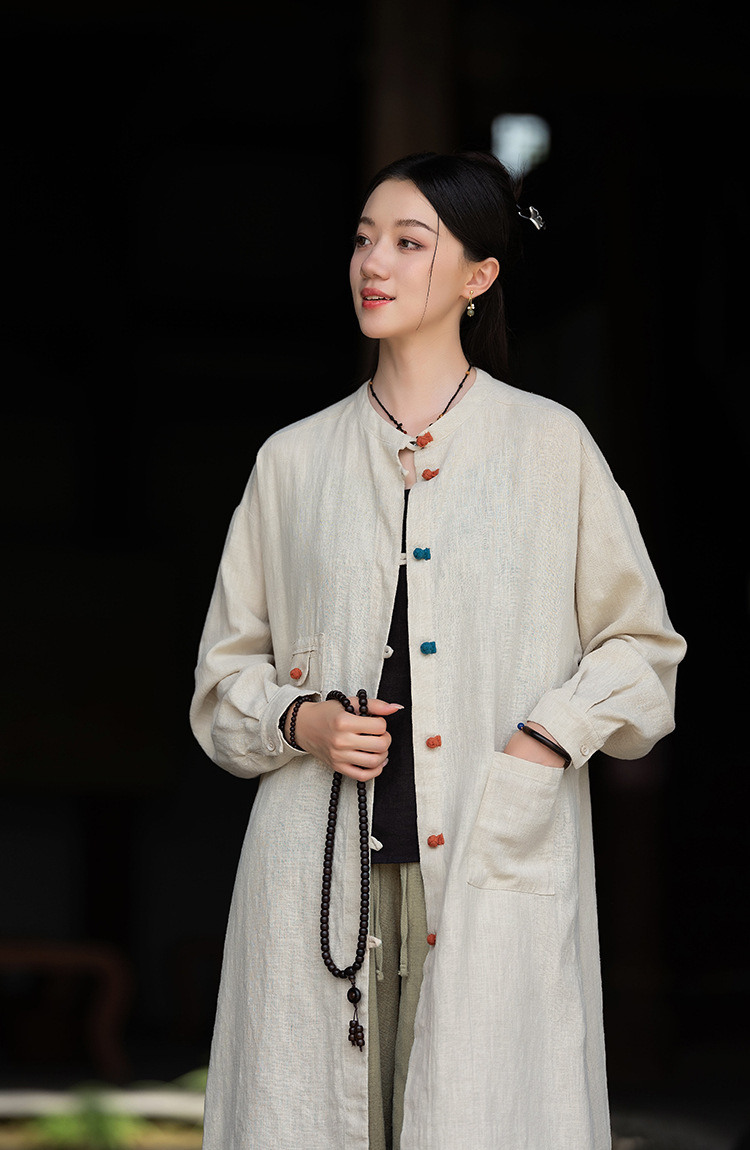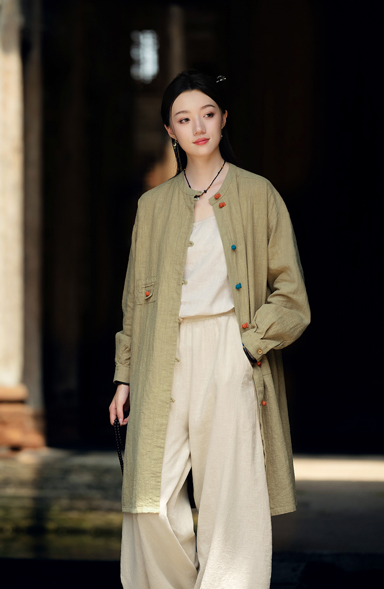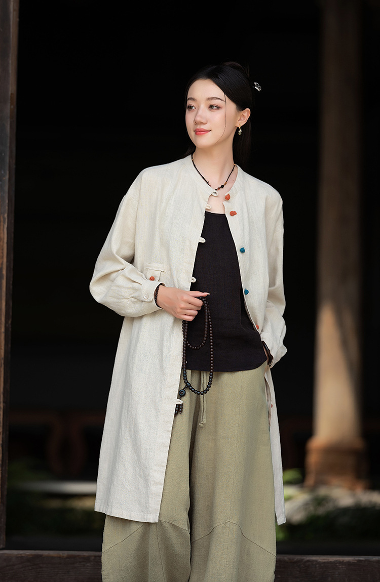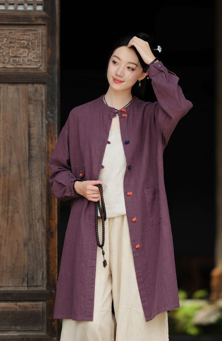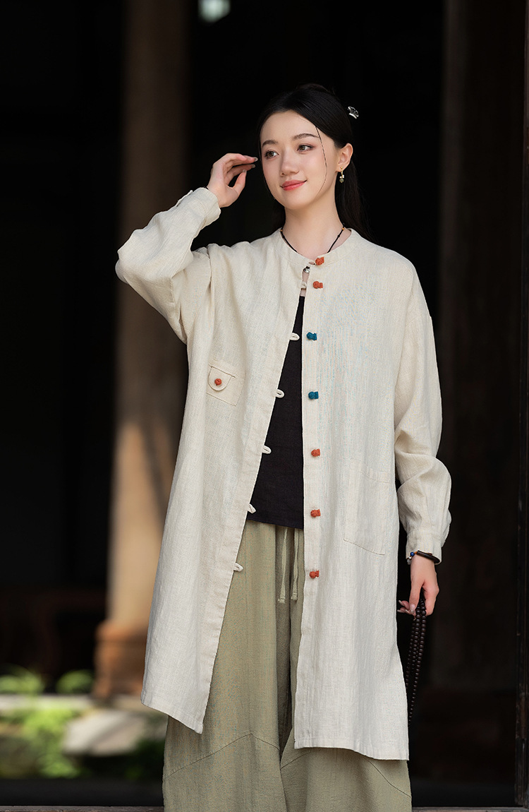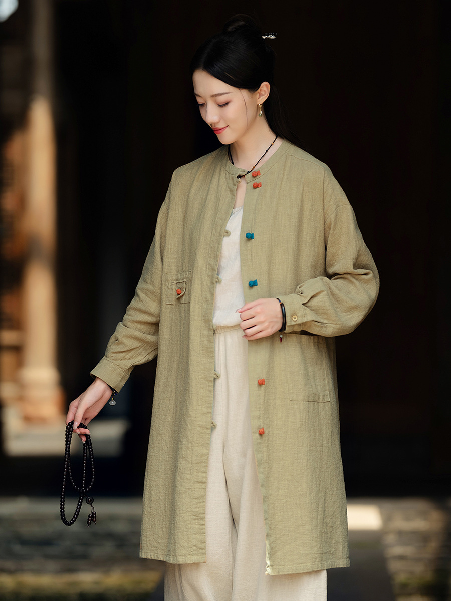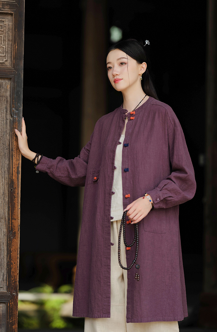 25면마 혼방 여성복 신상품, 예술적 레트로 스타일의 스탠드 칼라 배색 단추 자켓, 샌드워시 면마 셔츠 여성용 가디건스토어 가기