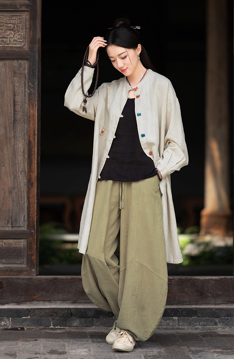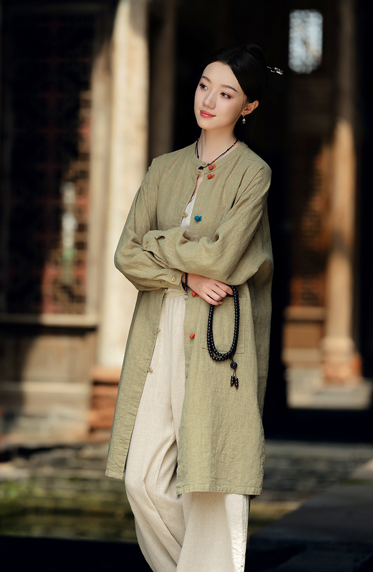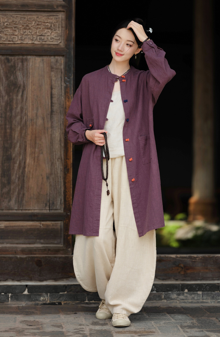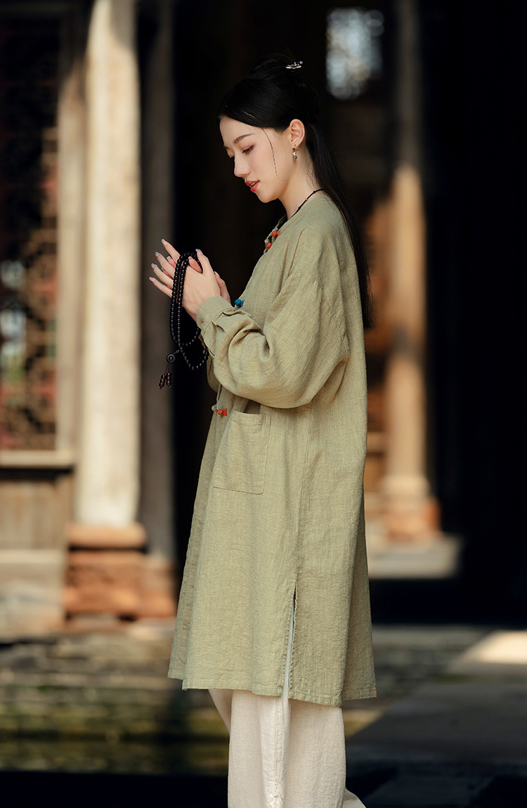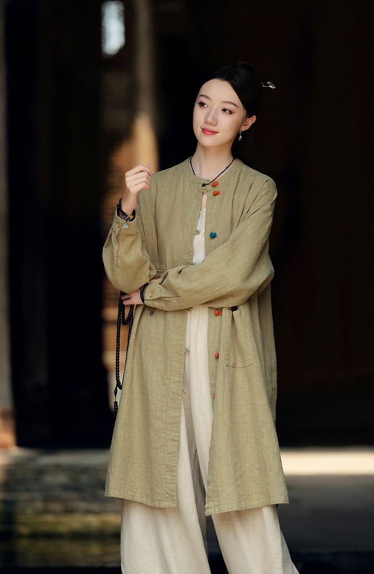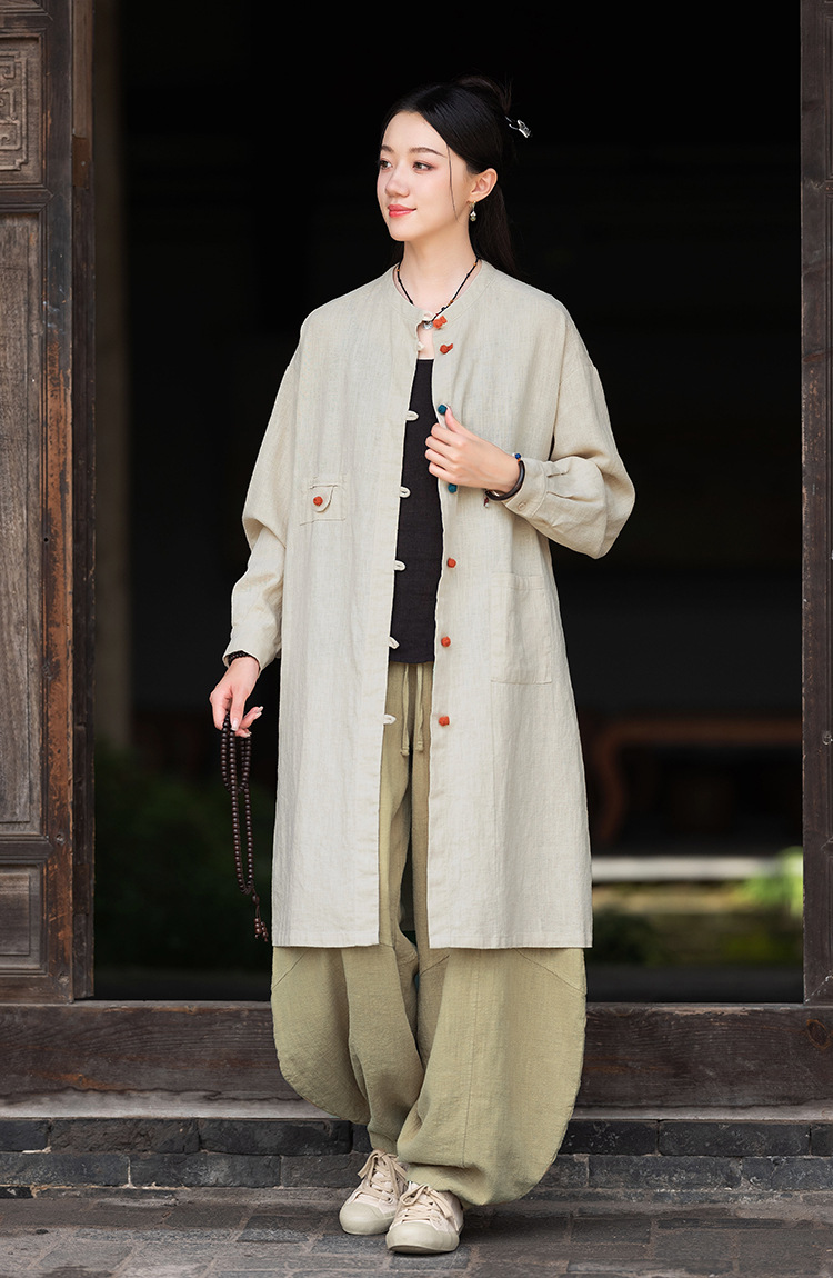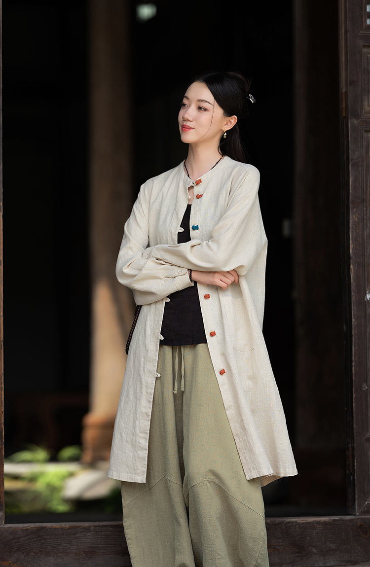 25면마 혼방 여성복 신상품, 예술적 레트로 스타일의 스탠드 칼라 배색 단추 자켓, 샌드워시 면마 셔츠 여성용 가디건스토어 가기
