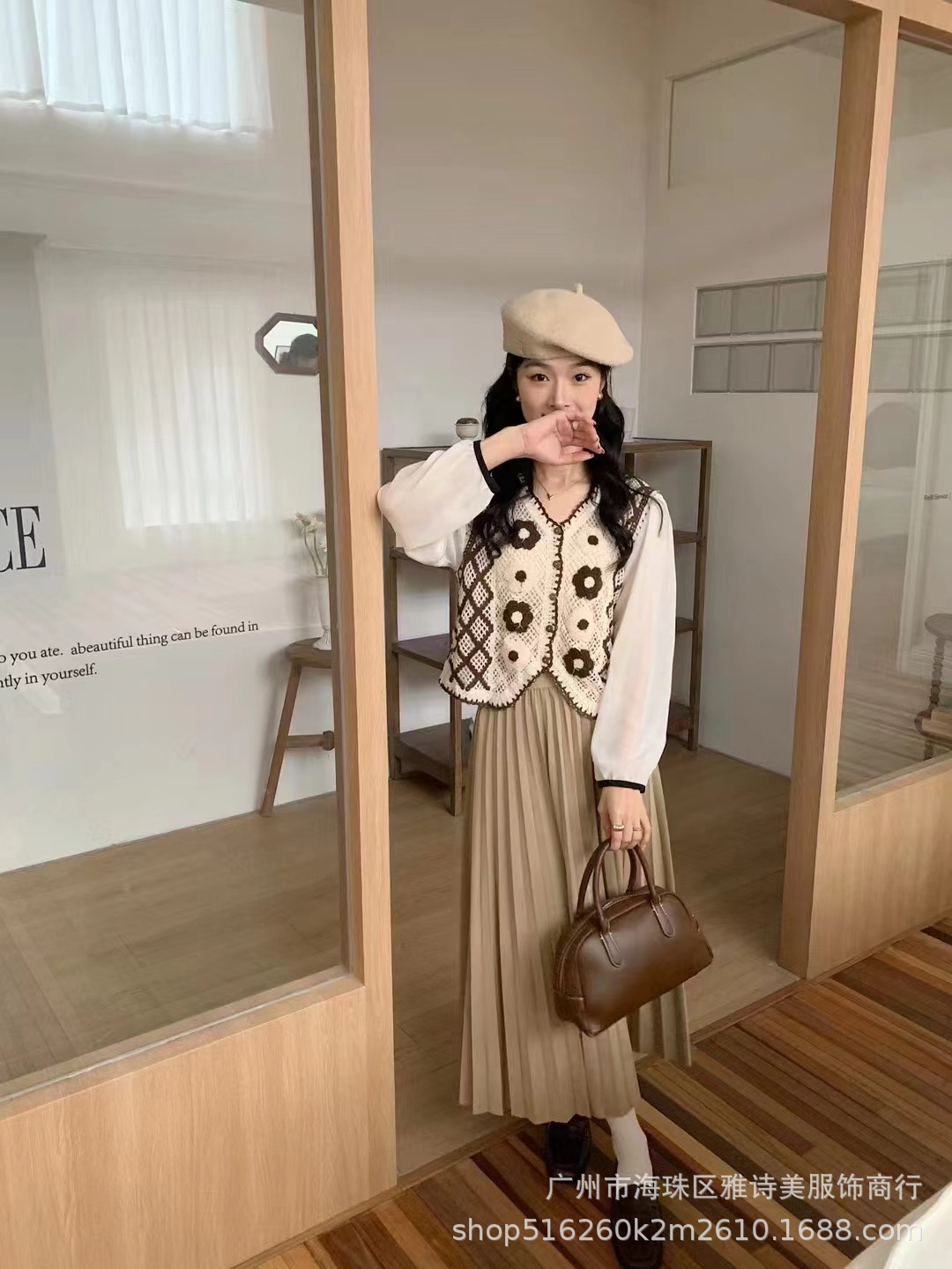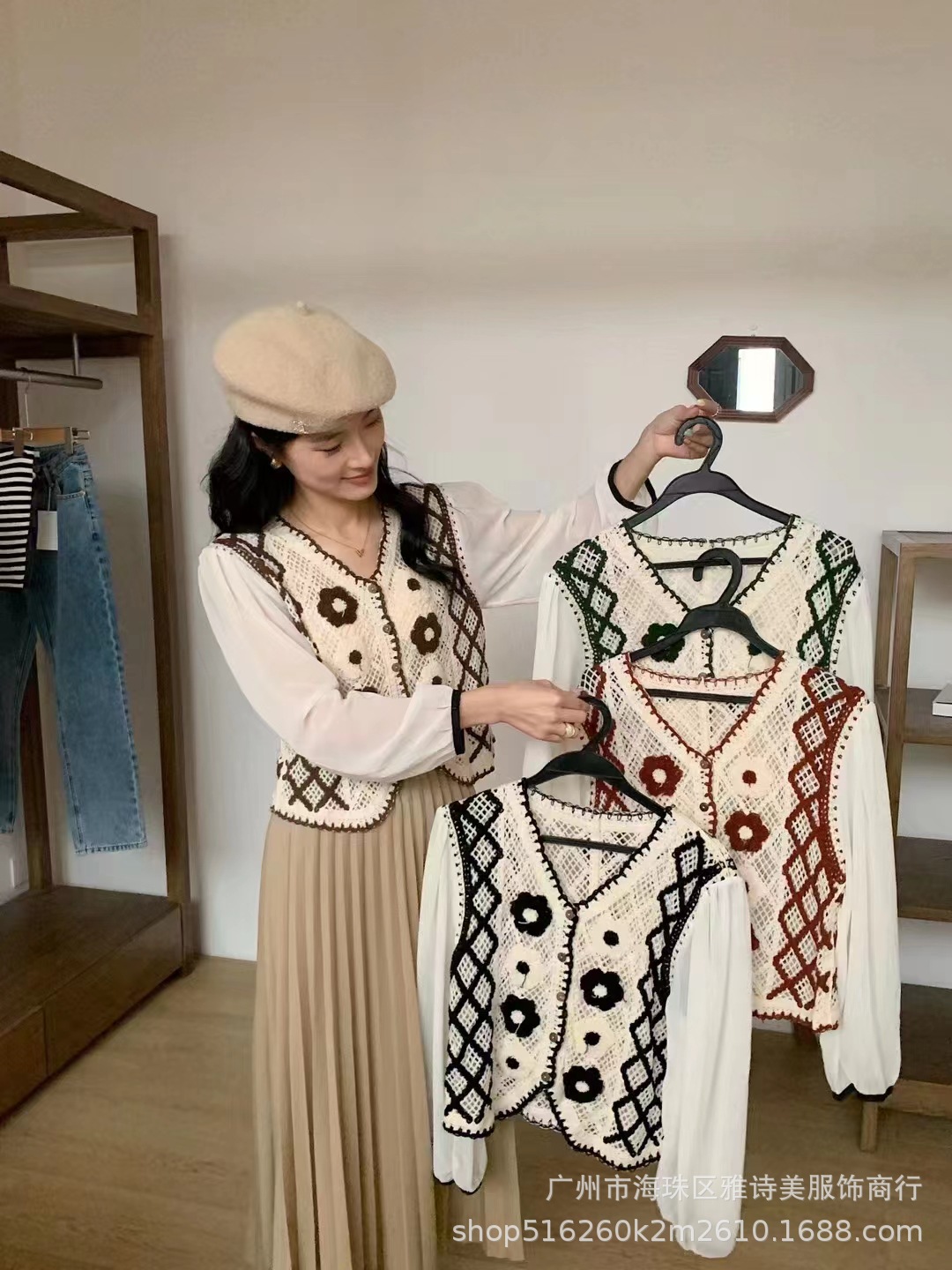 가을 프랑스 스타일 빈티지 세련된 중공 스티칭 꽃 쉬폰 셔츠 여성용 틈새 디자인 센스 슬림 퍼프 슬리브 탑스토어 가기