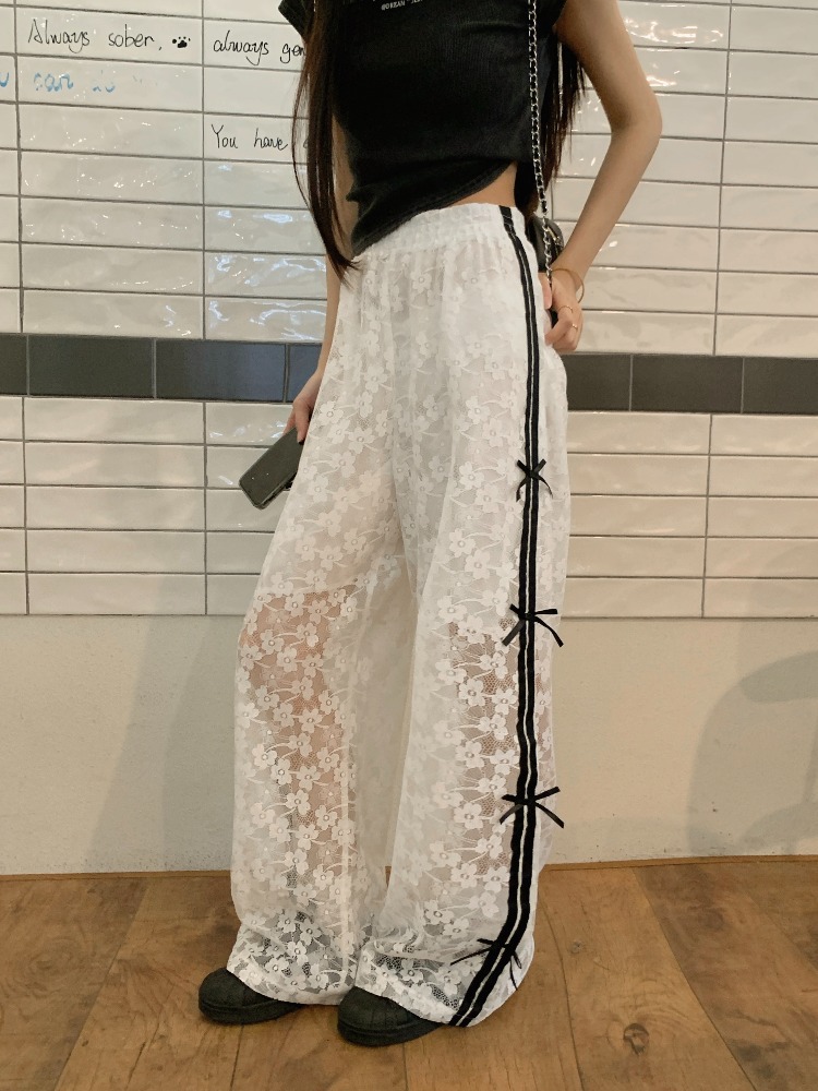 활 레이스 중공 캐주얼 바지 여성의 초가을 디자인 세련된 높은 허리 슬리밍 높은 허리 슬리밍 스트레이트 바지
