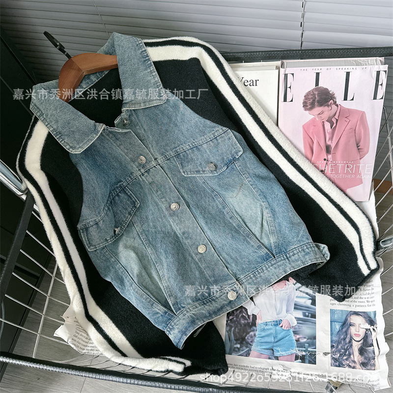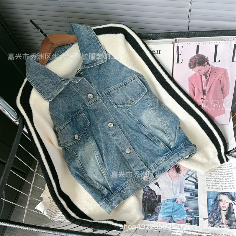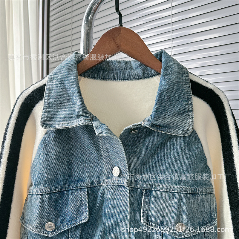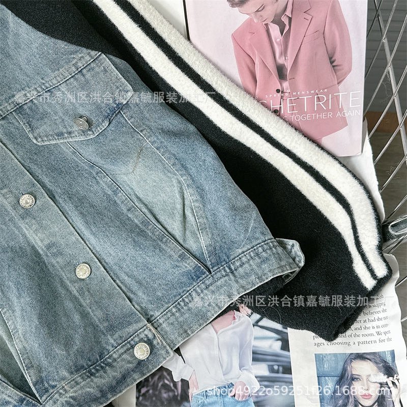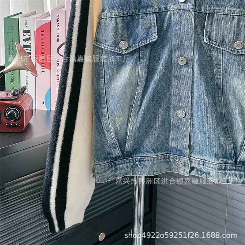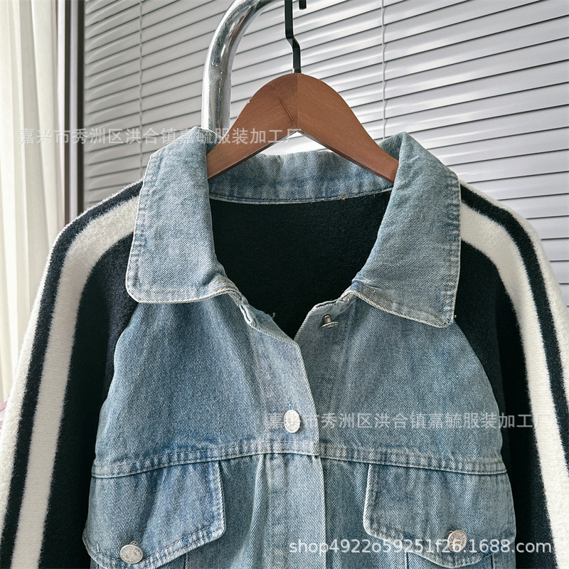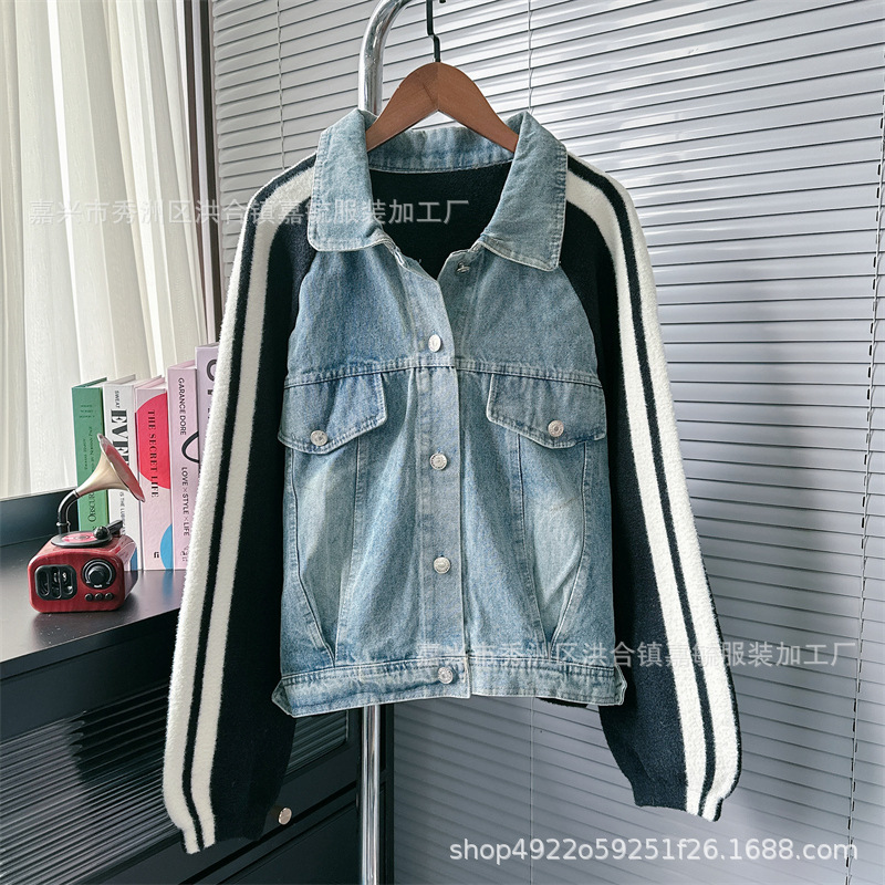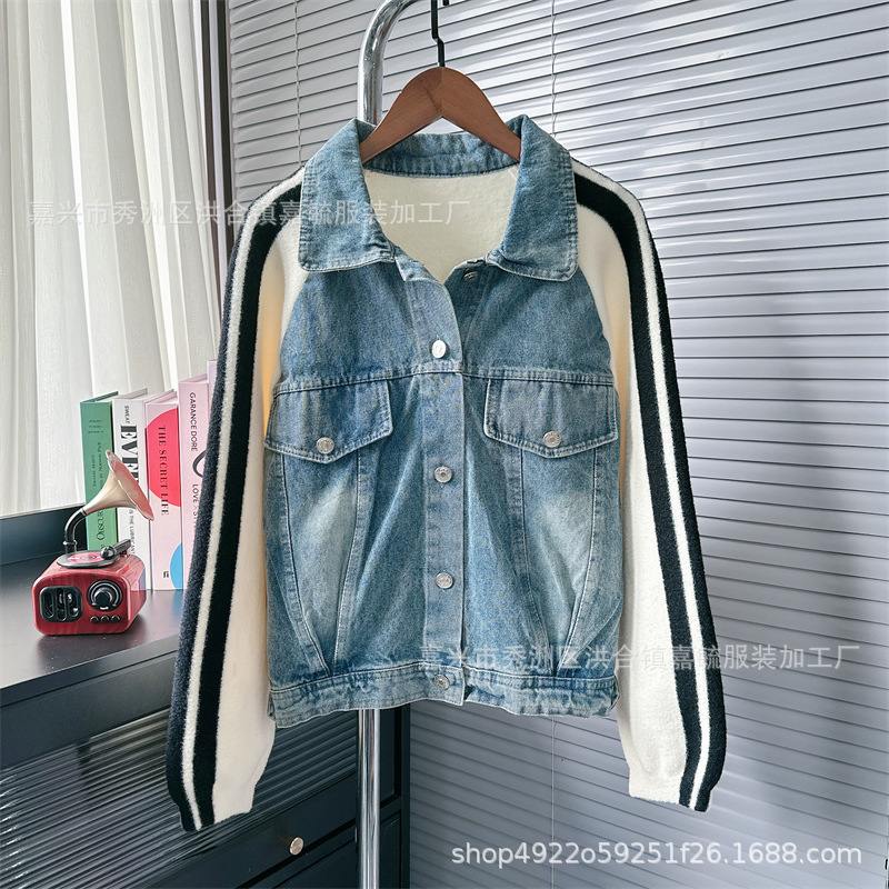 대조적 인 컬러 데님 스티칭 스웨터 카디건 여성의 2024 가을과 겨울 새로운 디자인 감각 패션 올 매치 코트 조수스토어 가기