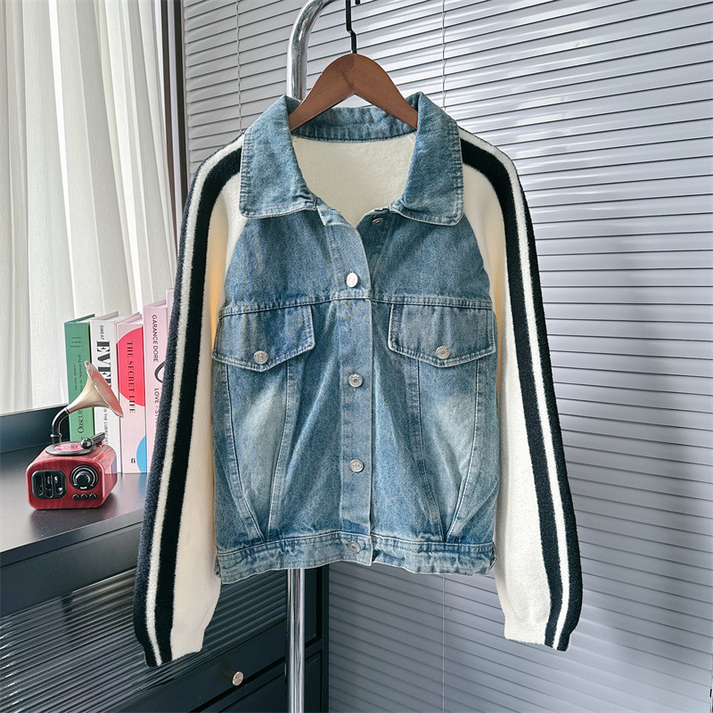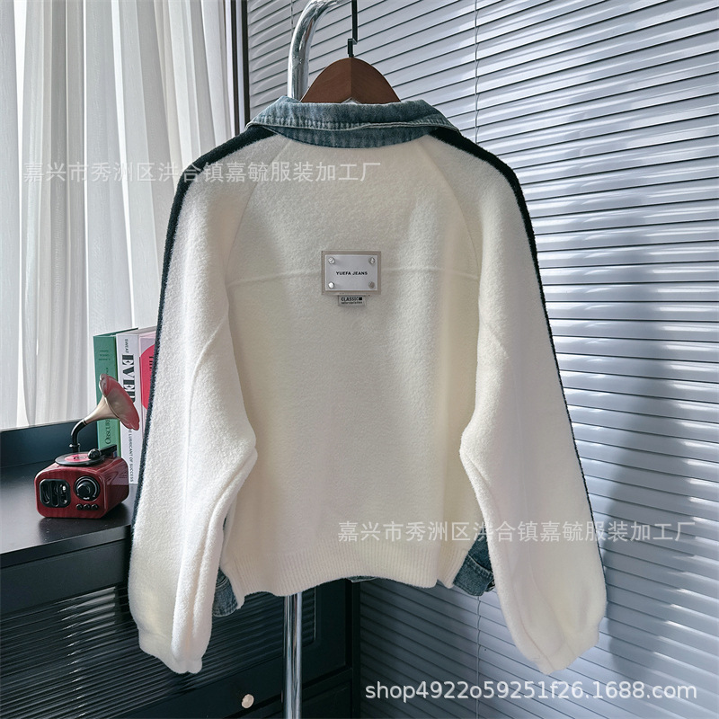 대조적 인 컬러 데님 스티칭 스웨터 카디건 여성의 2024 가을과 겨울 새로운 디자인 감각 패션 올 매치 코트 조수