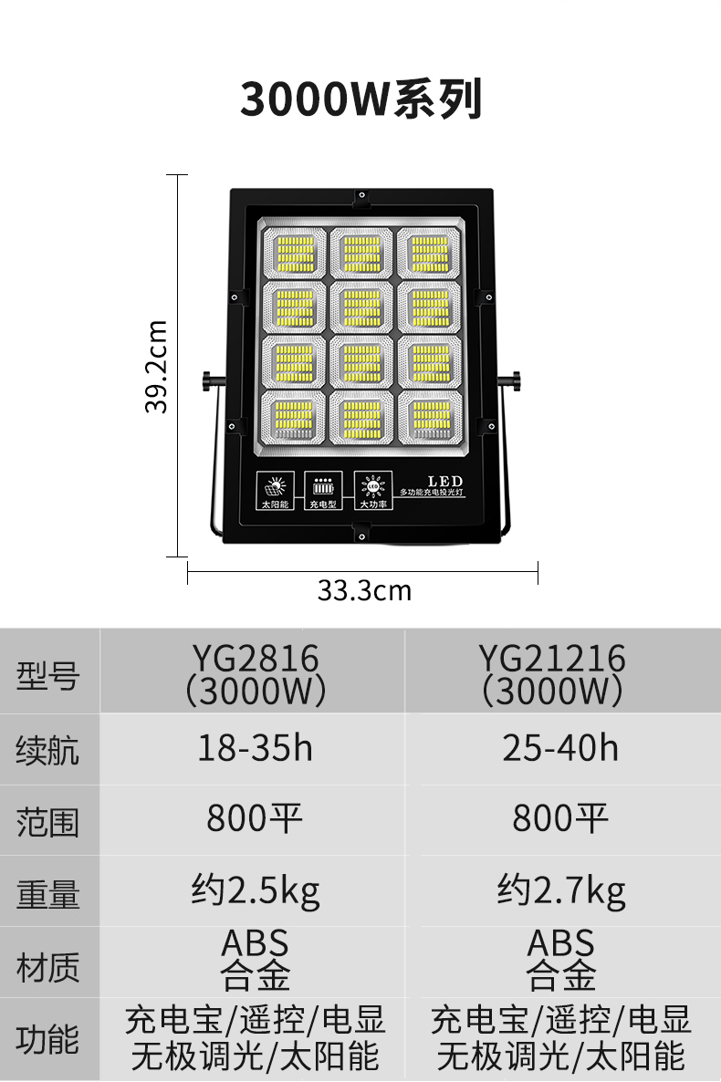 • 800W 엔지니어링 모델(용량 업그레이드) + 리모컨/배터리 수명 12-18시간 투광 조명 300평방미터