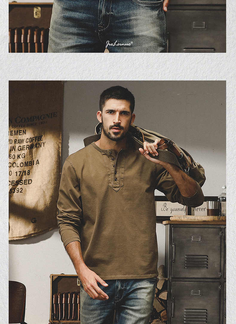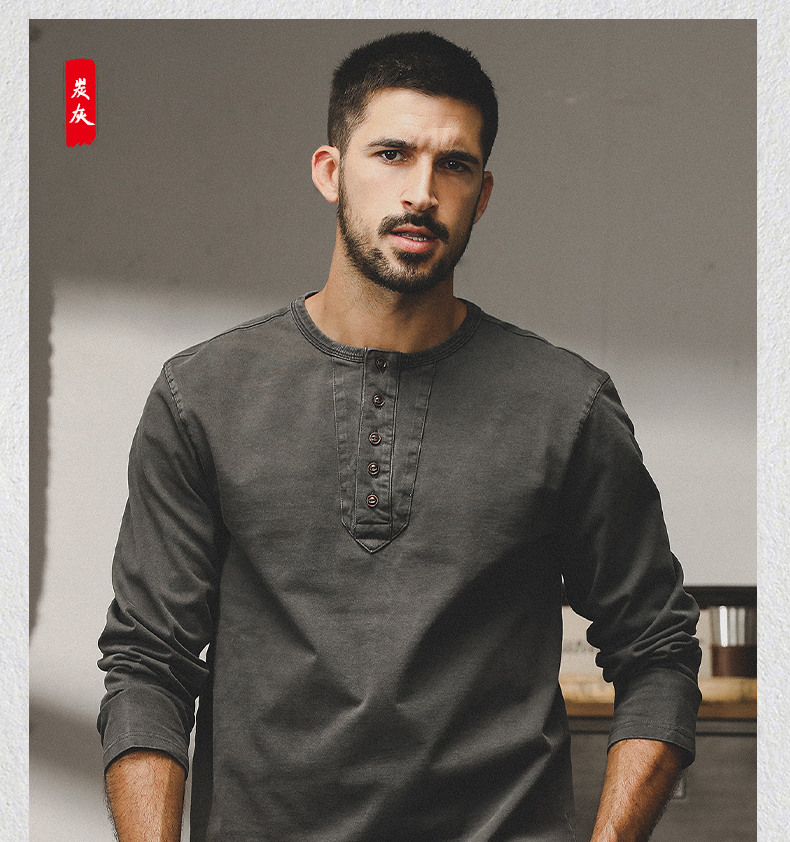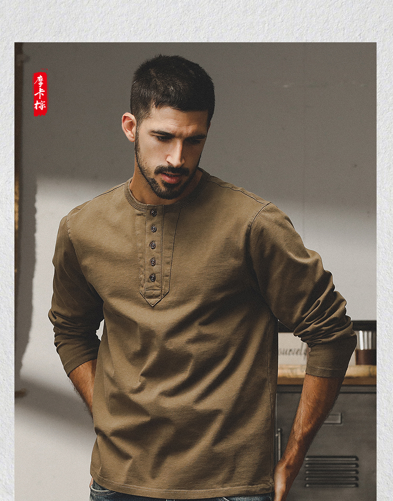 아메리칸 스타일 레트로 긴팔 티셔츠 남자 2024 새로운 유행 브랜드 루즈 헨리 칼라 탑 남자 가을 퓨어 코튼 티셔츠
