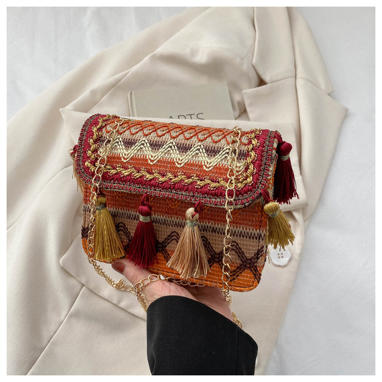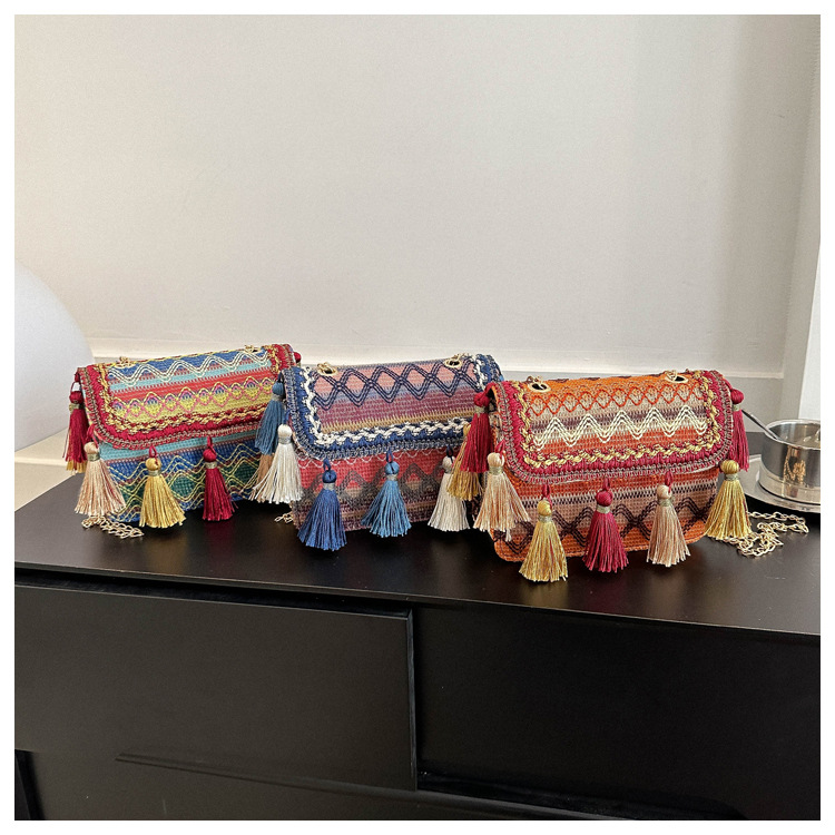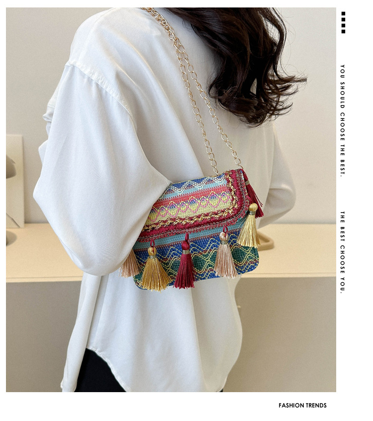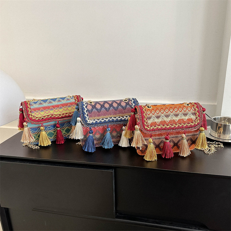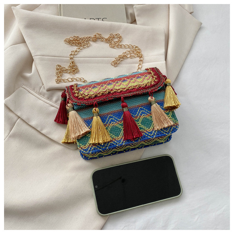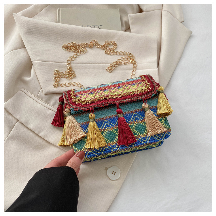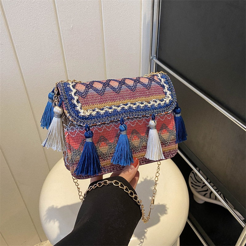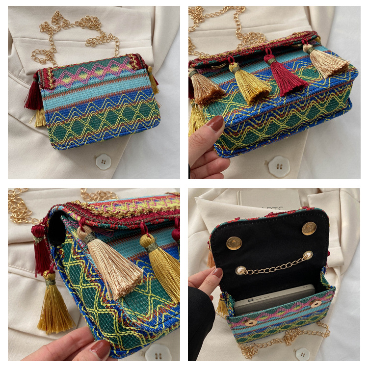 어깨 가방 여성 가방 2024 새로운 체인 어깨 가방 여성 민족 스타일 술 작은 광장 가방 개인화 된 크로스 바디 백 국경스토어 가기