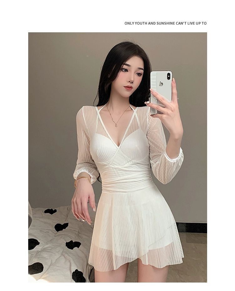 여성 수영복 여름 2025 원피스 스커트형 배 가리기 슬림핏 보수적 레이스 긴팔 작은 가슴 스틸 브라 온천 수영복스토어 가기