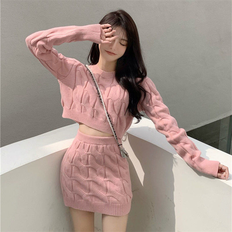 트위스트 니트 스웨터 세트 2024 게으른 두꺼운 스커트 여성용 슬림 핏 긴팔 하이 허리 엉덩이 스커트 투피스 세트