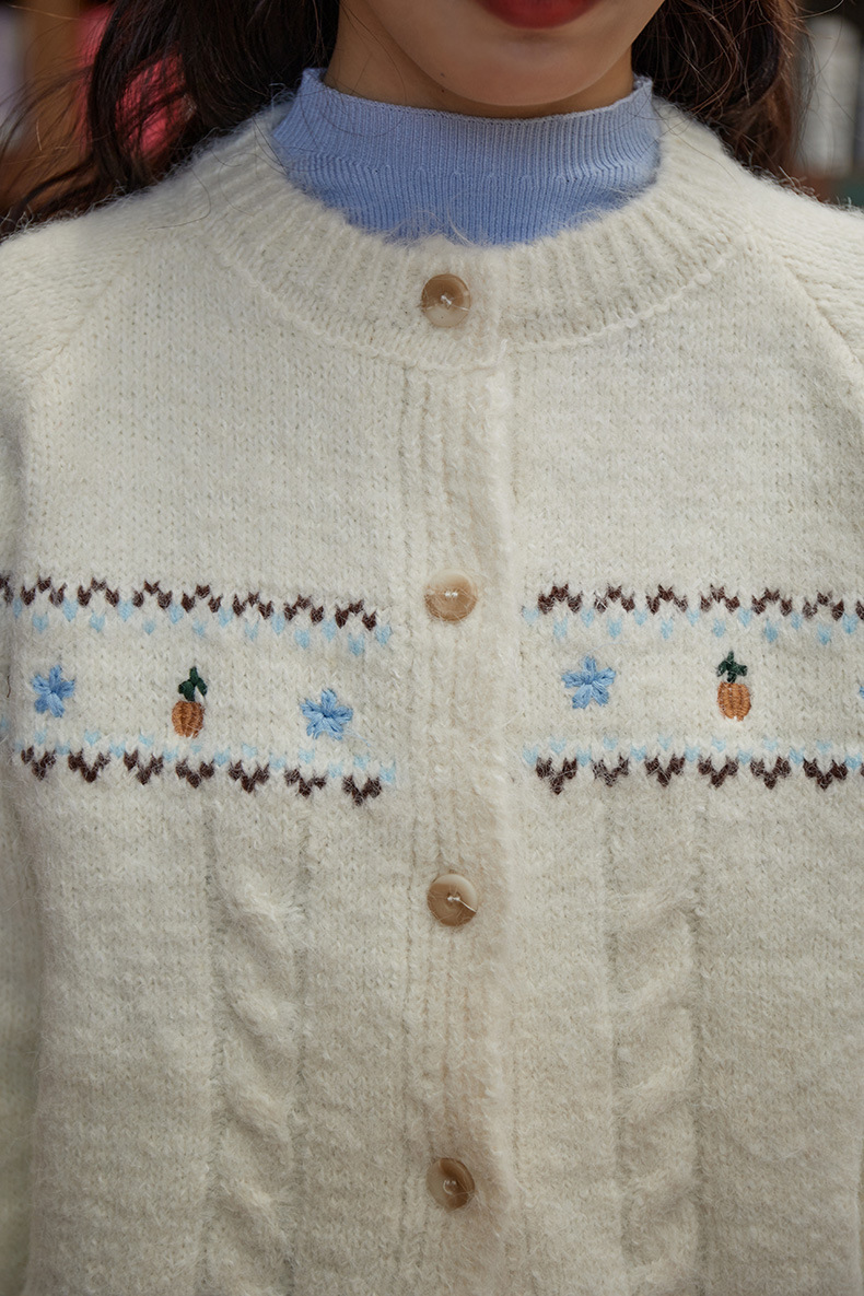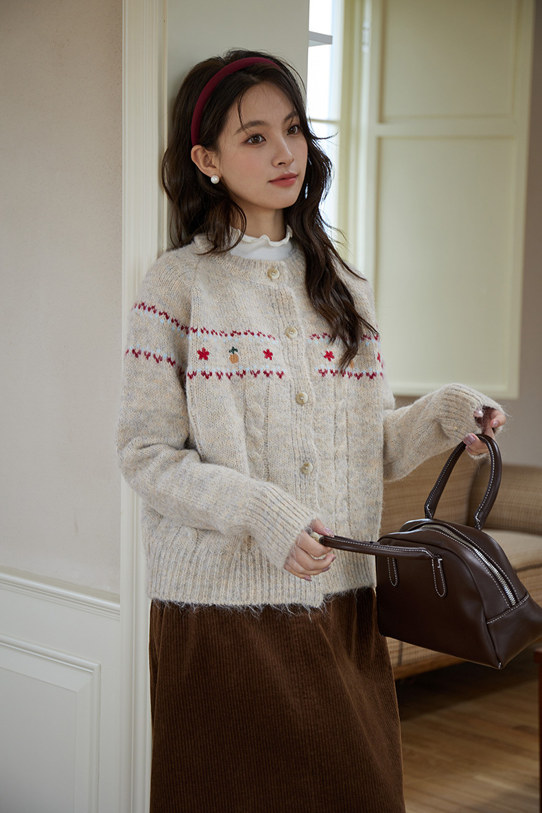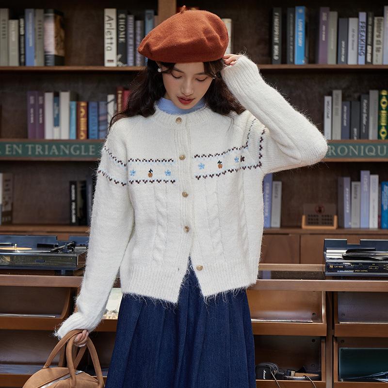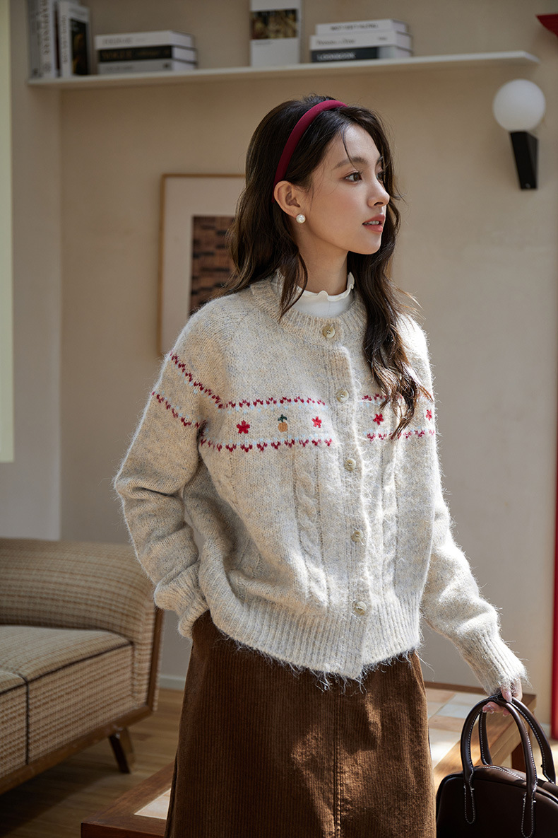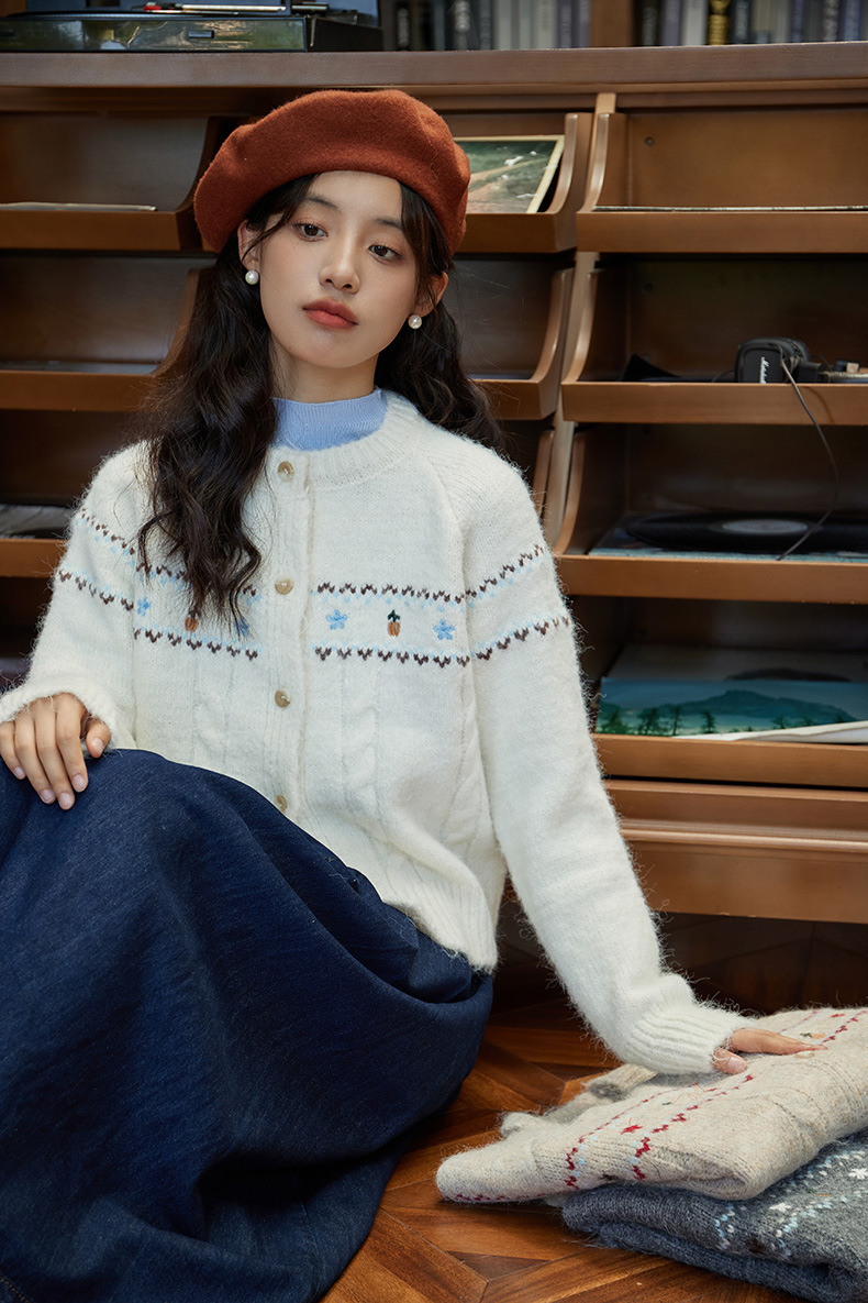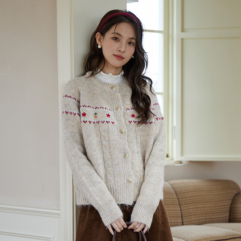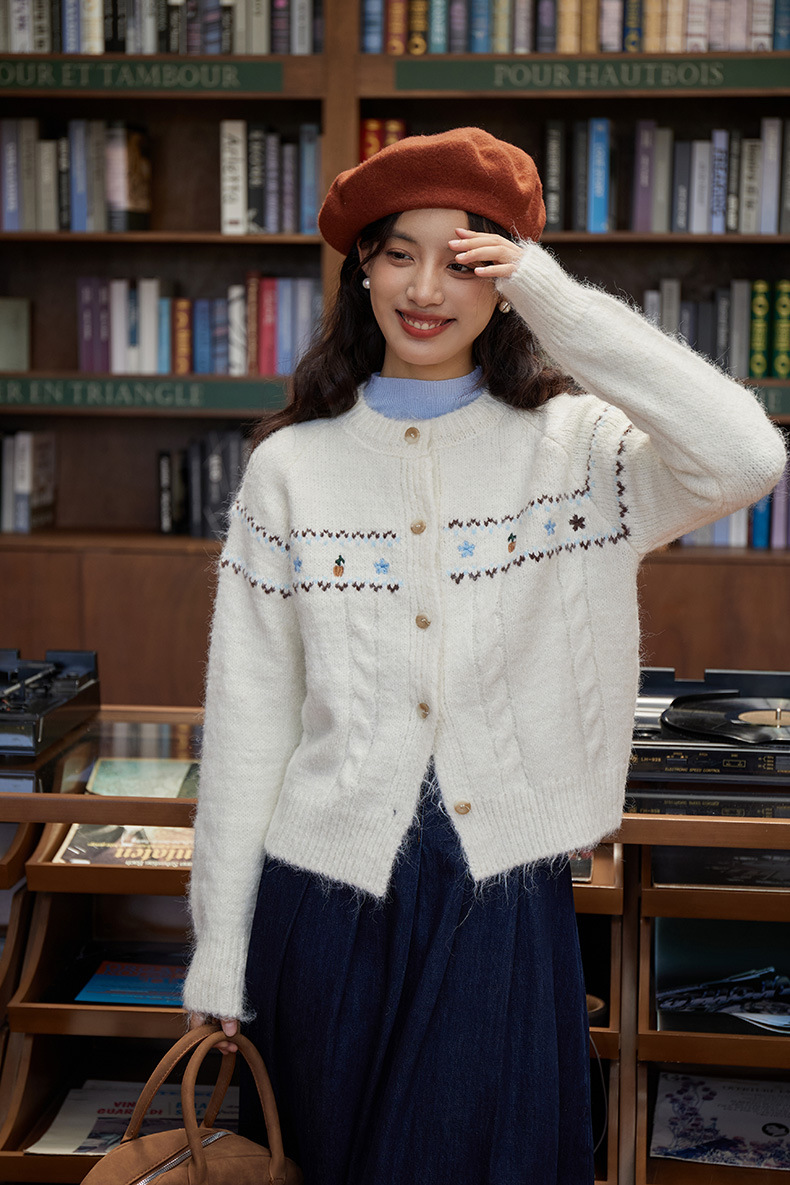 2024 가을과 겨울 새로운 예술 복고풍 꽃 자수 트위스트 스트립 크루 넥 스웨터 코트 여성용 니트 카디건 스웨터