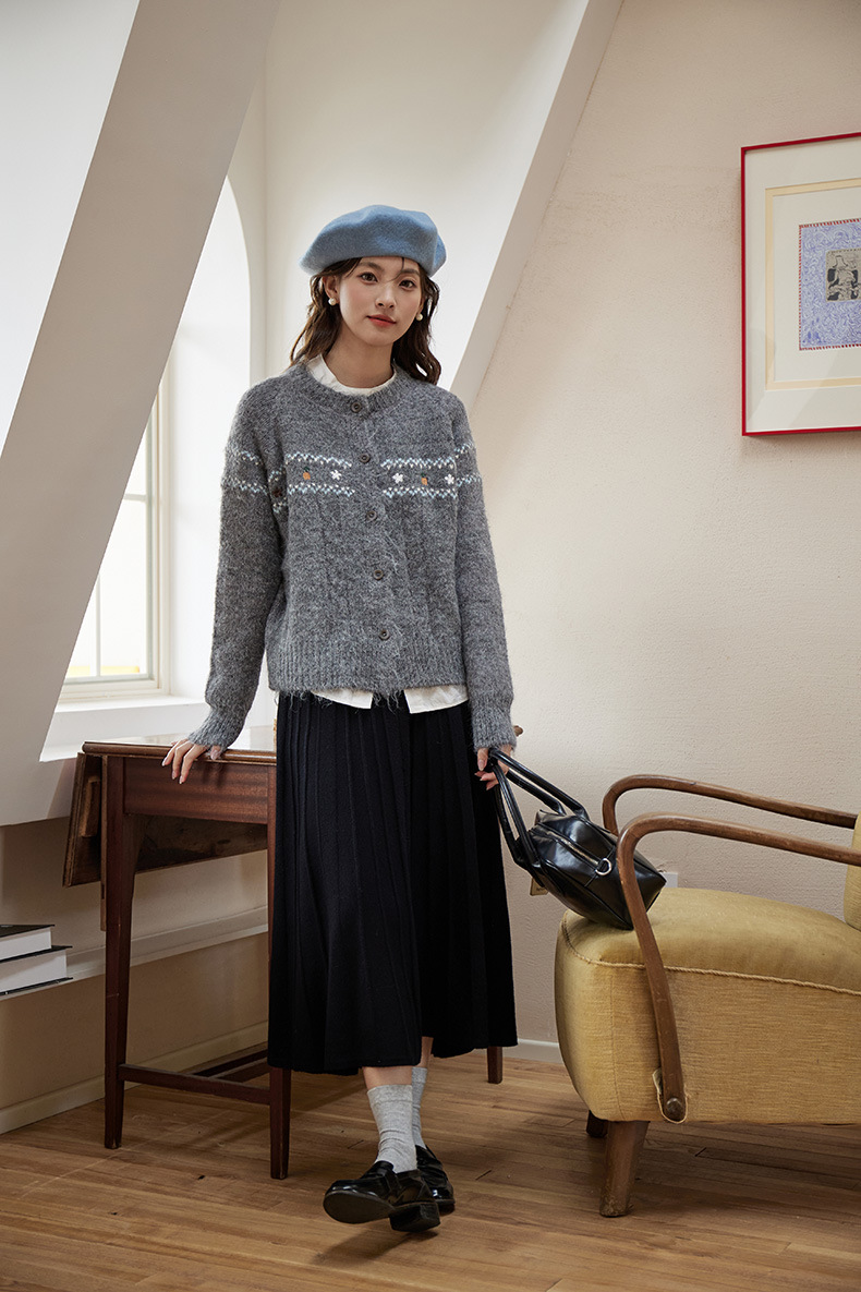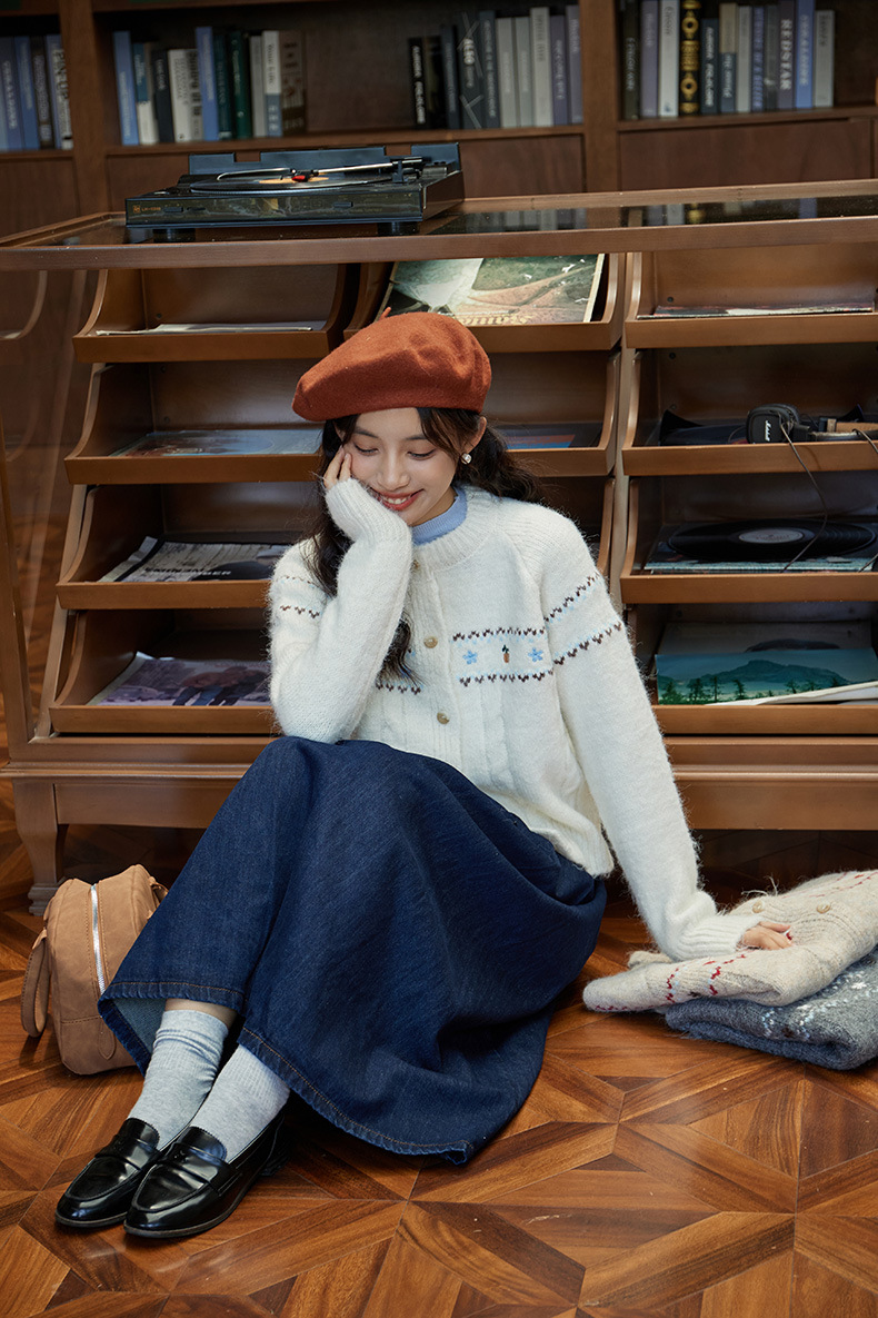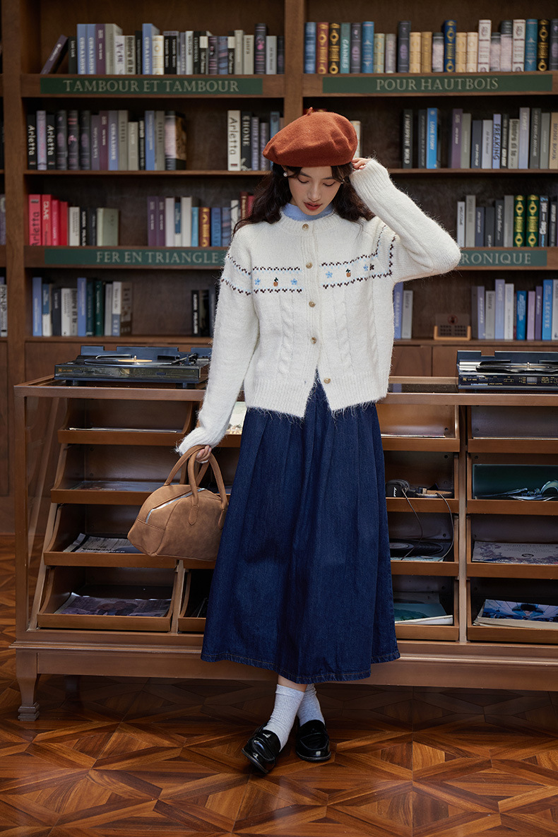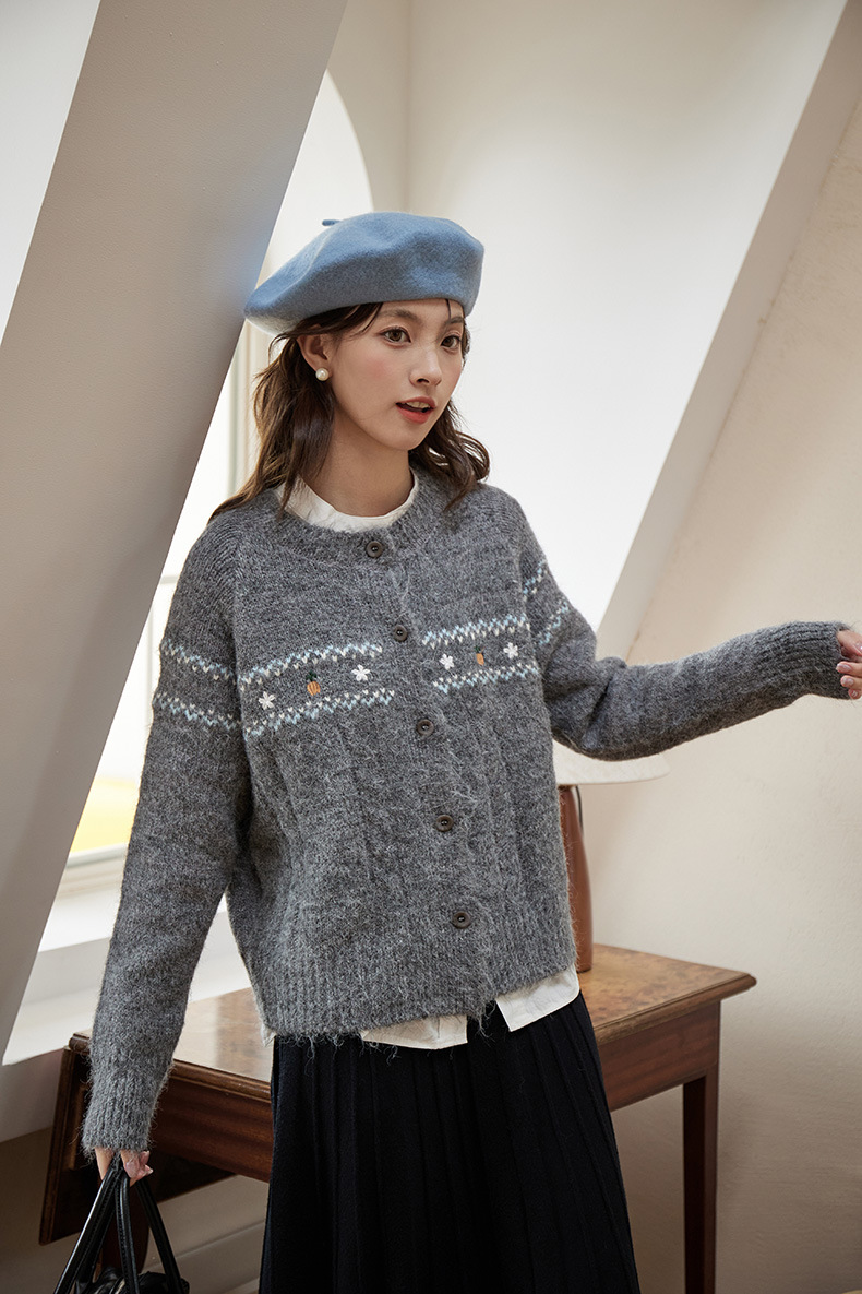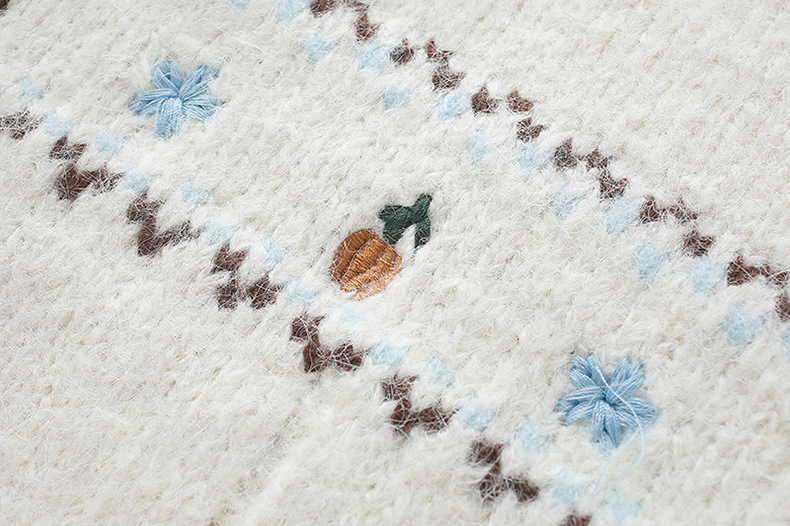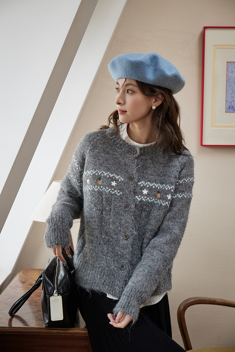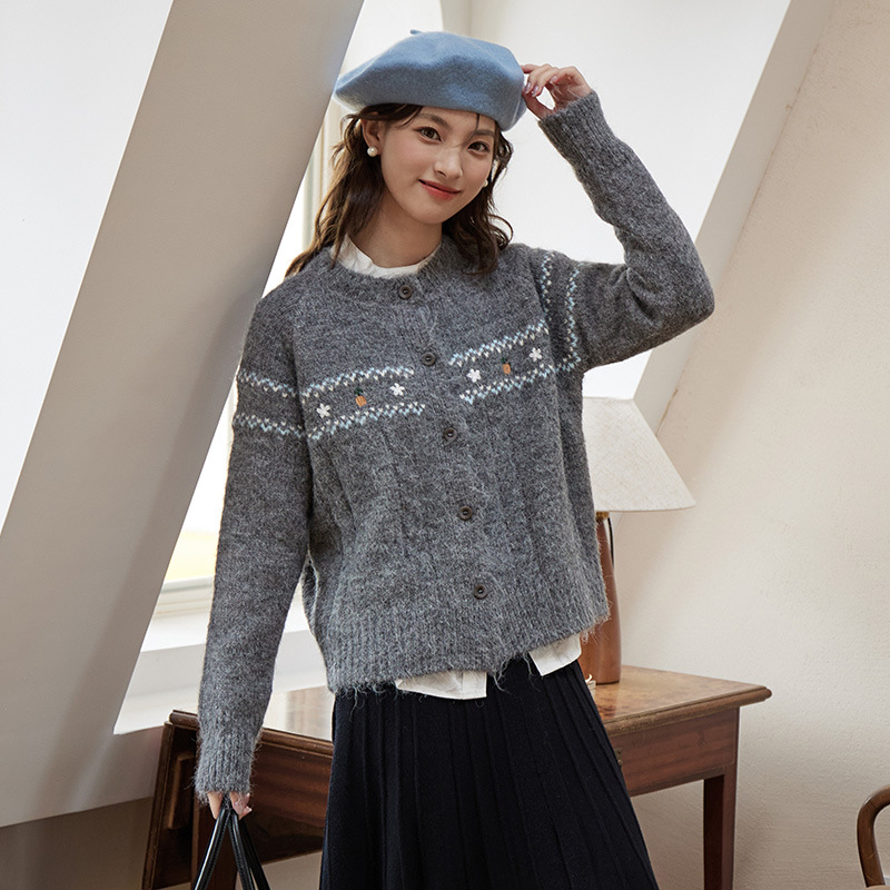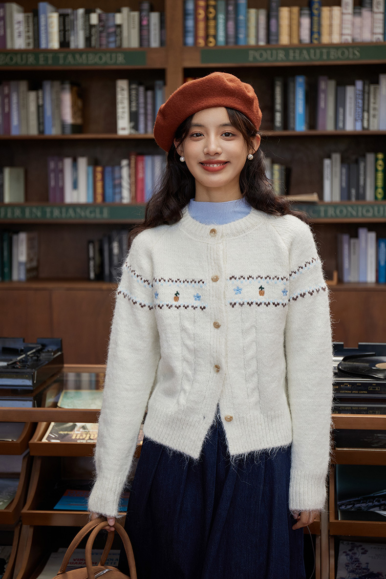 2024 가을과 겨울 새로운 예술 복고풍 꽃 자수 트위스트 스트립 크루 넥 스웨터 코트 여성용 니트 카디건 스웨터