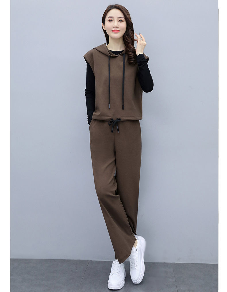 세련된 외국 스타일 세트 여성의 2024 가을 새로운 기질 시대-슬림 넓은 다리 바지 캐주얼 여성 의류 3 피스 패션 감소스토어 가기
