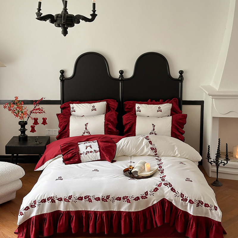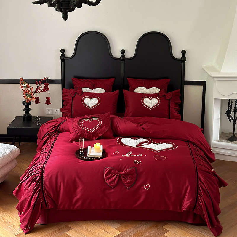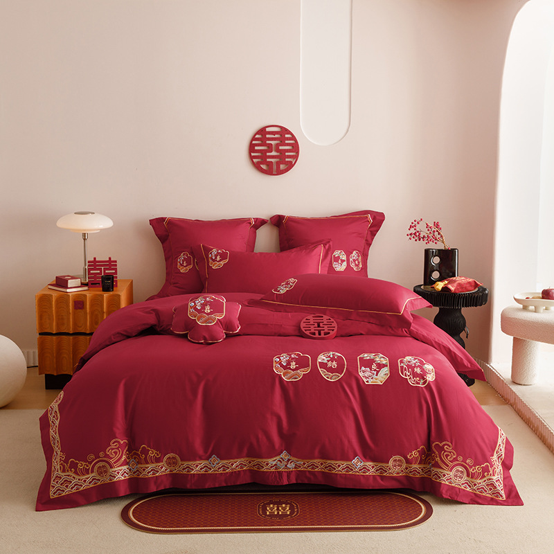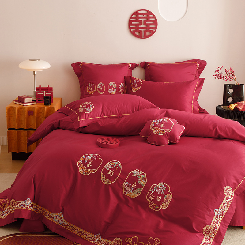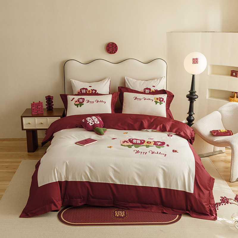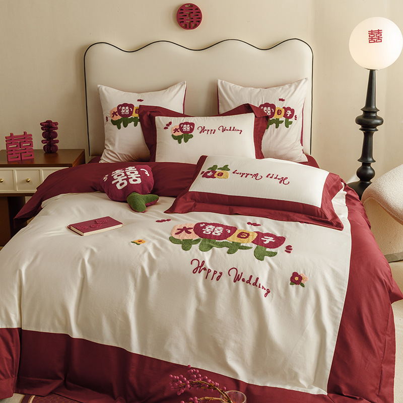 면 긴 스테이플 코튼 새로운 웨딩 4 피스 세트 100 면 자수 침대 시트 퀼트 커버 웨딩 웨딩 침구