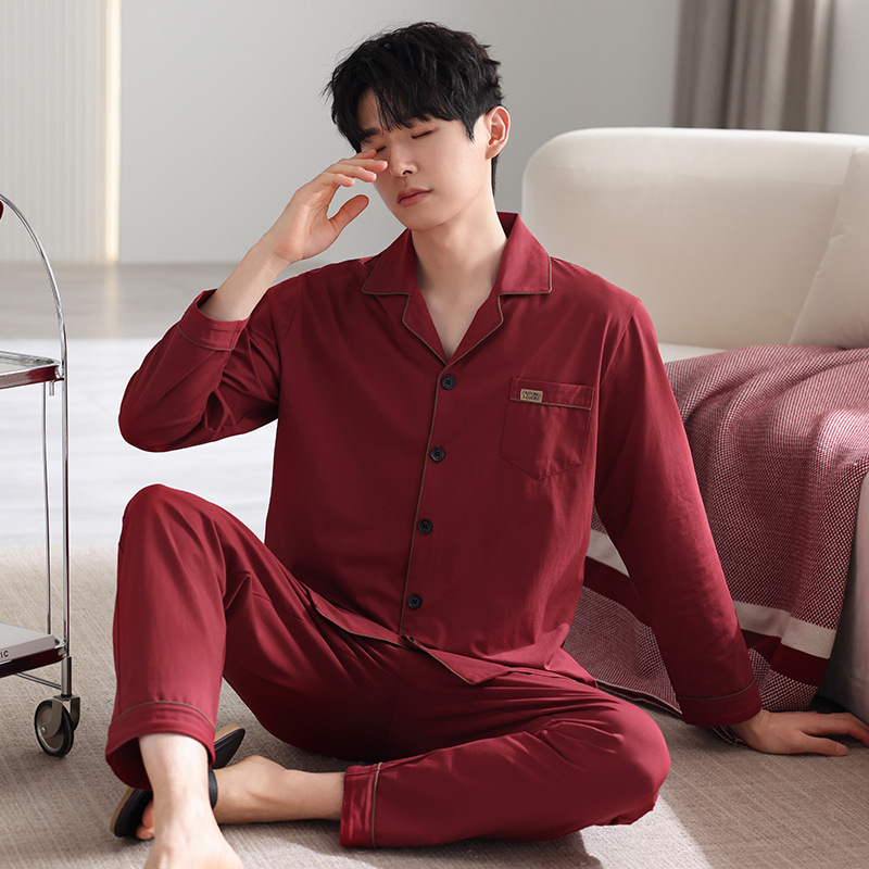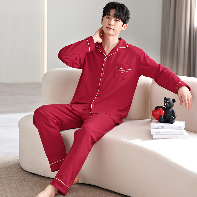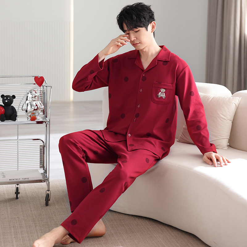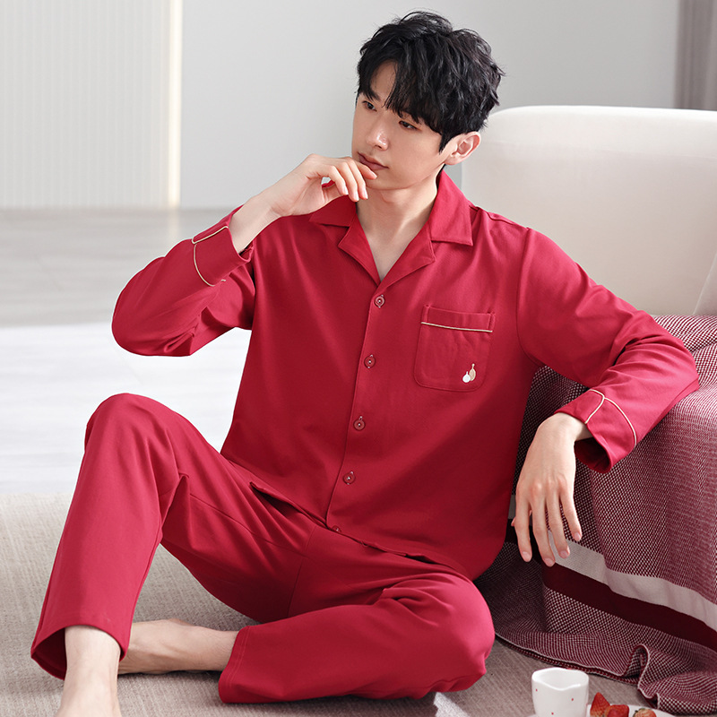 2024 년 잠옷 남성면 카디건 옷깃 긴 소매 세트 가을과 겨울 새 웨딩 레드 아우터 홈 의류
