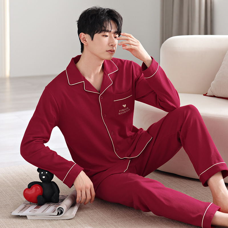 2024 년 잠옷 남성면 카디건 옷깃 긴 소매 세트 가을과 겨울 새 웨딩 레드 아우터 홈 의류스토어 가기