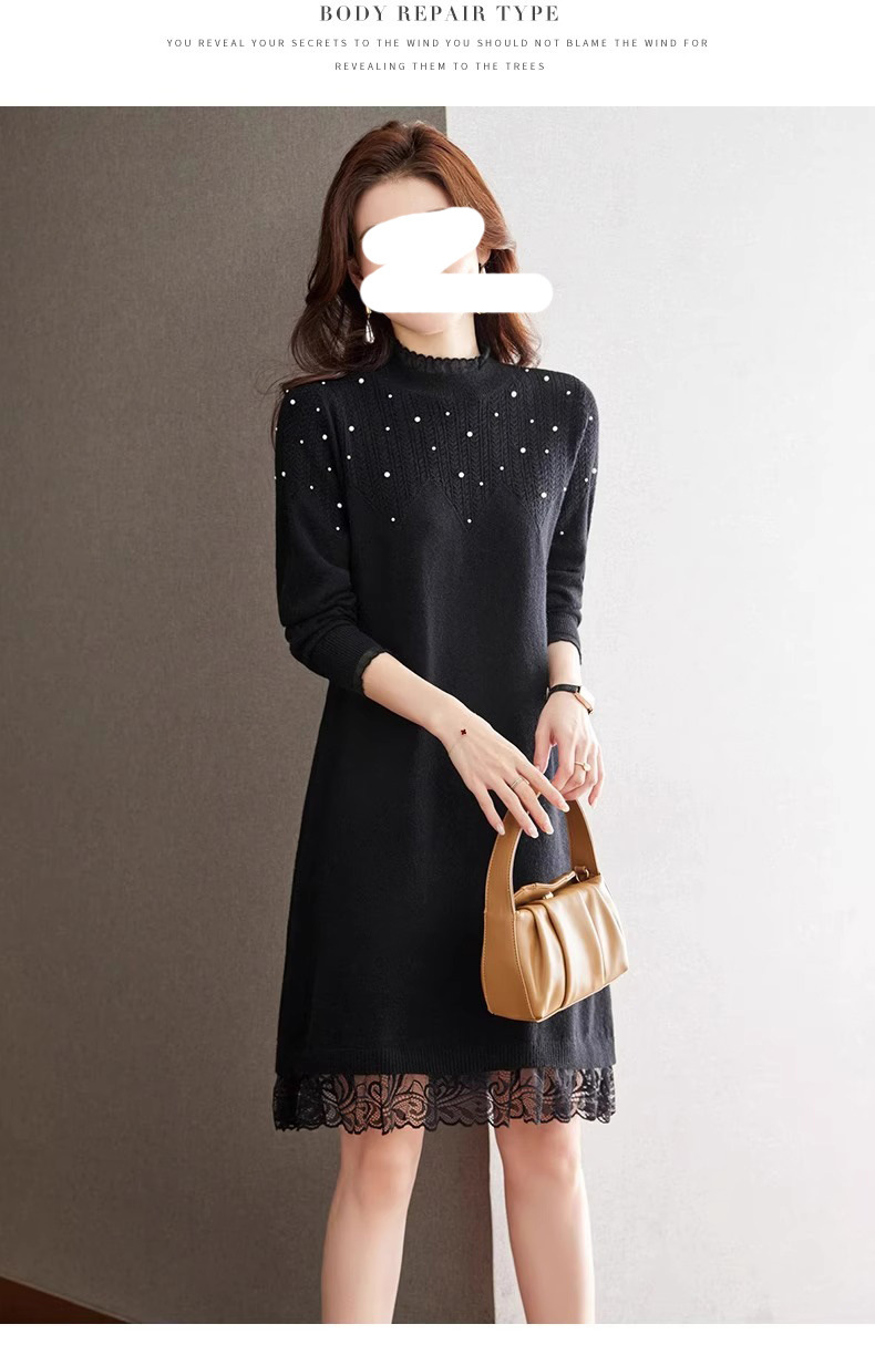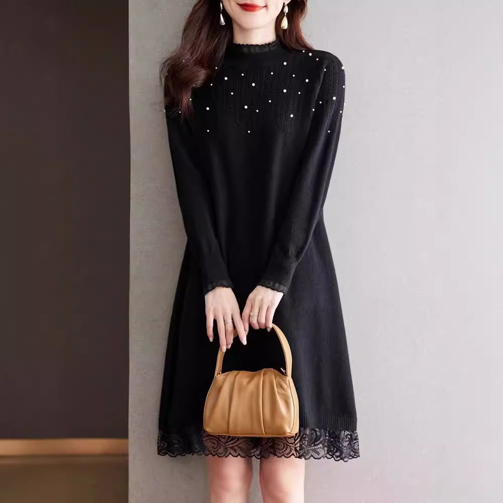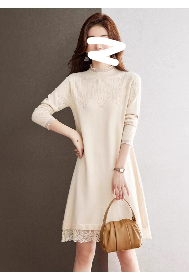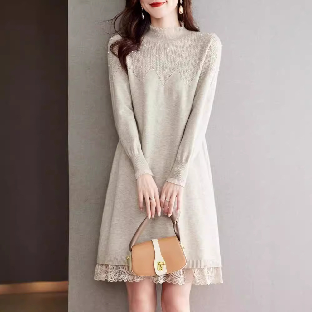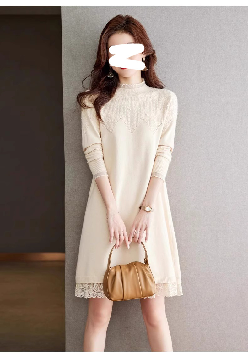 니트 원피스 2024 여성용 쁘띠 가을과 겨울 내베이스 셔츠를위한 새로운 스타일 레이스 하프 하이 넥 스웨터 원피스
