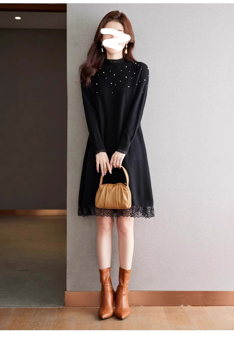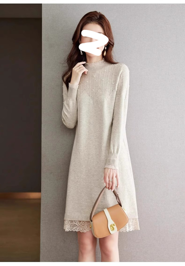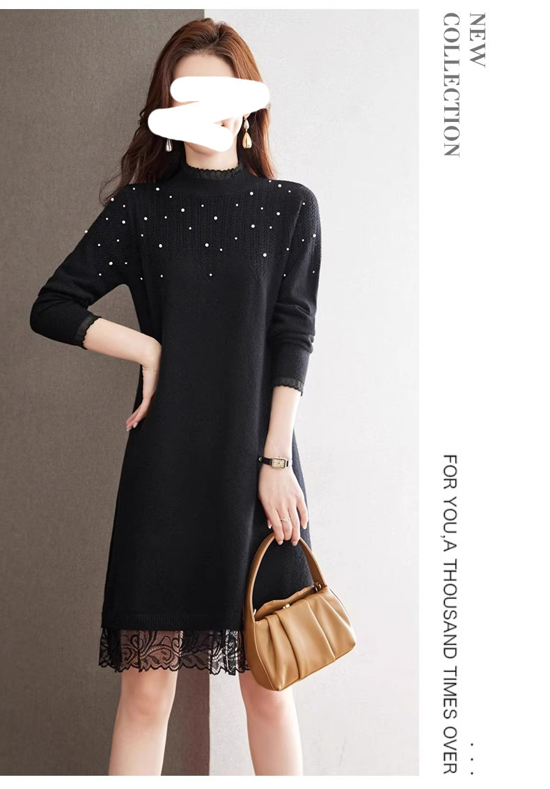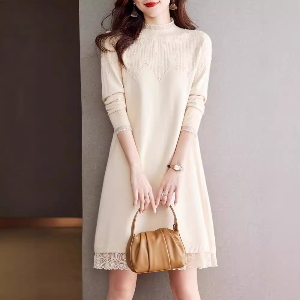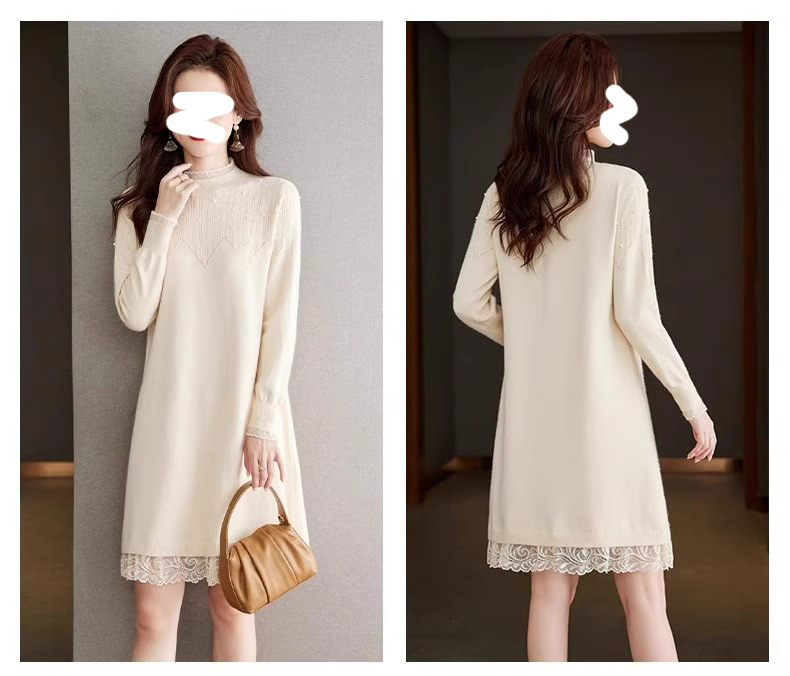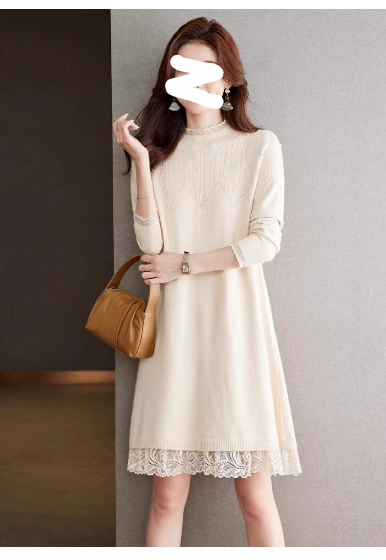 니트 원피스 2024 여성용 쁘띠 가을과 겨울 내베이스 셔츠를위한 새로운 스타일 레이스 하프 하이 넥 스웨터 원피스