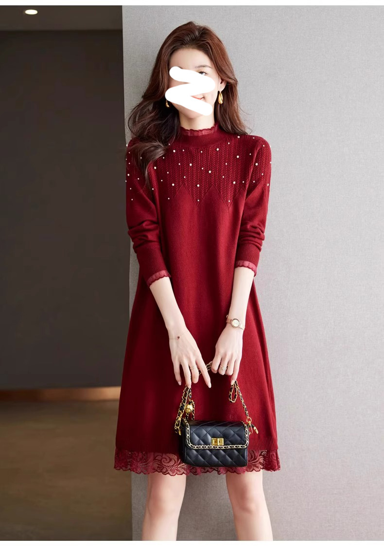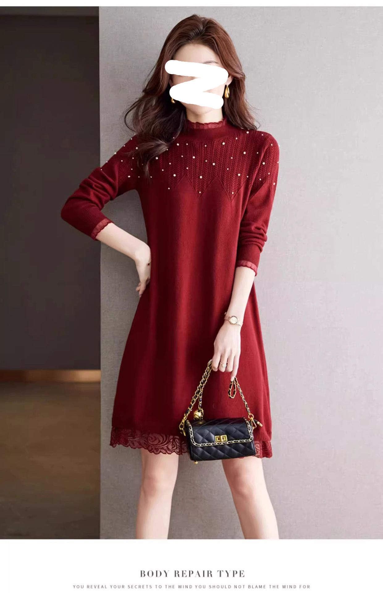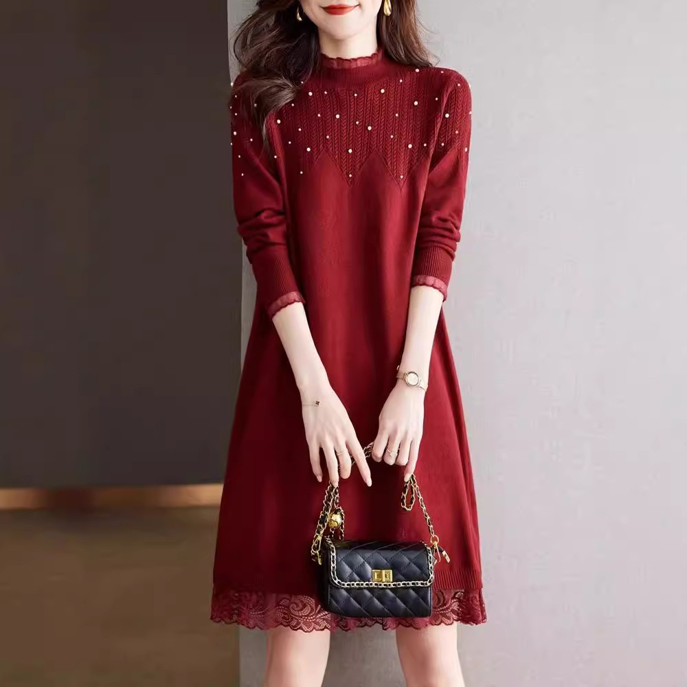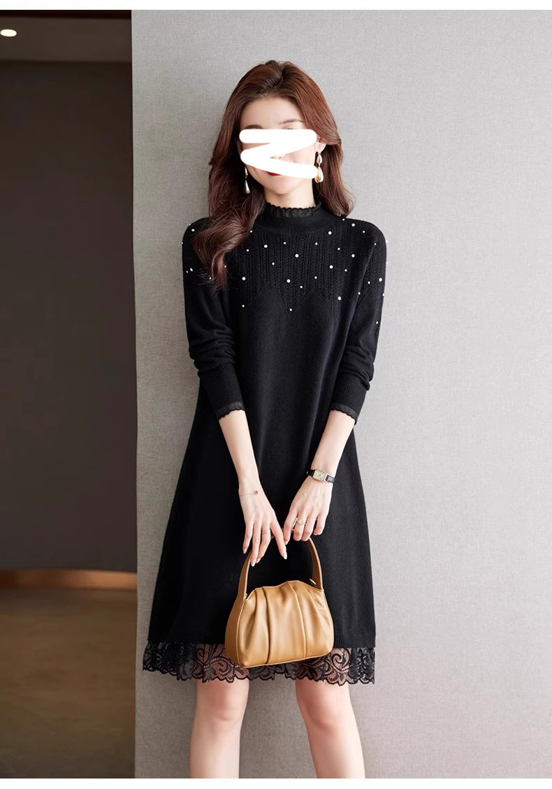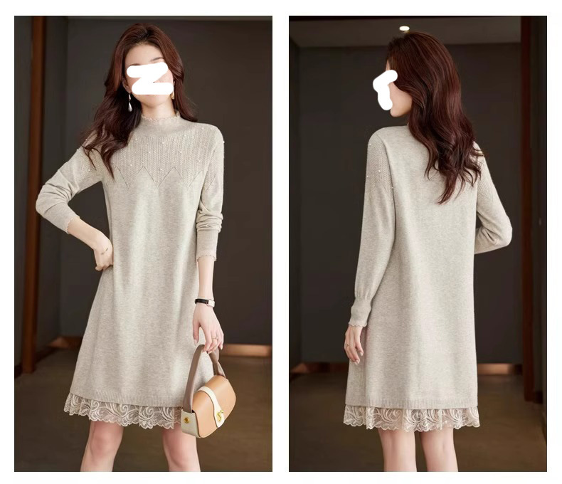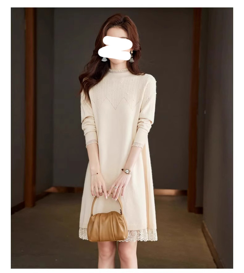 니트 원피스 2024 여성용 쁘띠 가을과 겨울 내베이스 셔츠를위한 새로운 스타일 레이스 하프 하이 넥 스웨터 원피스