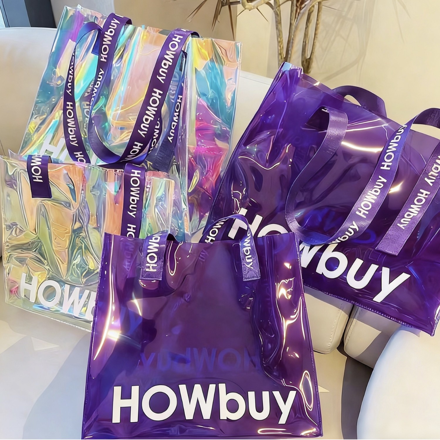 PVC 레이저 핸드백, 투명 젤리백, 환상적인 색상의 쇼핑백, 선물용 비닐봉투, 컬러 비닐봉투, 로고 인쇄스토어 가기