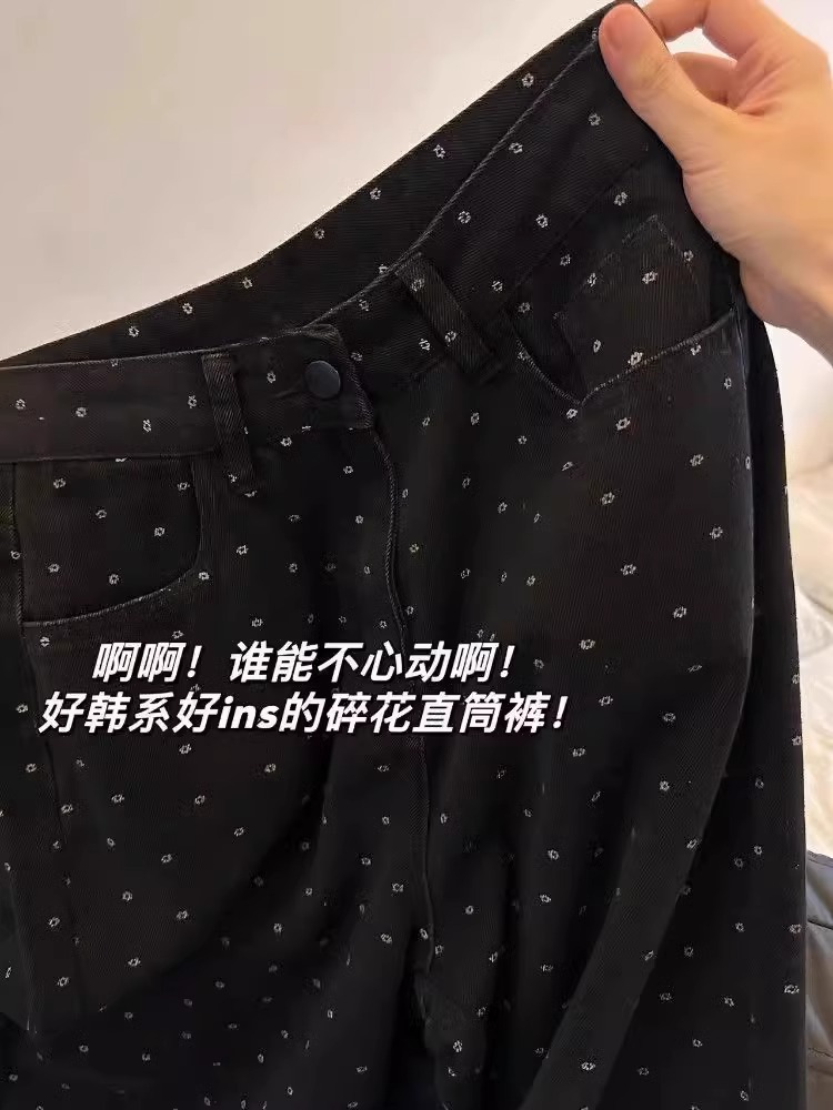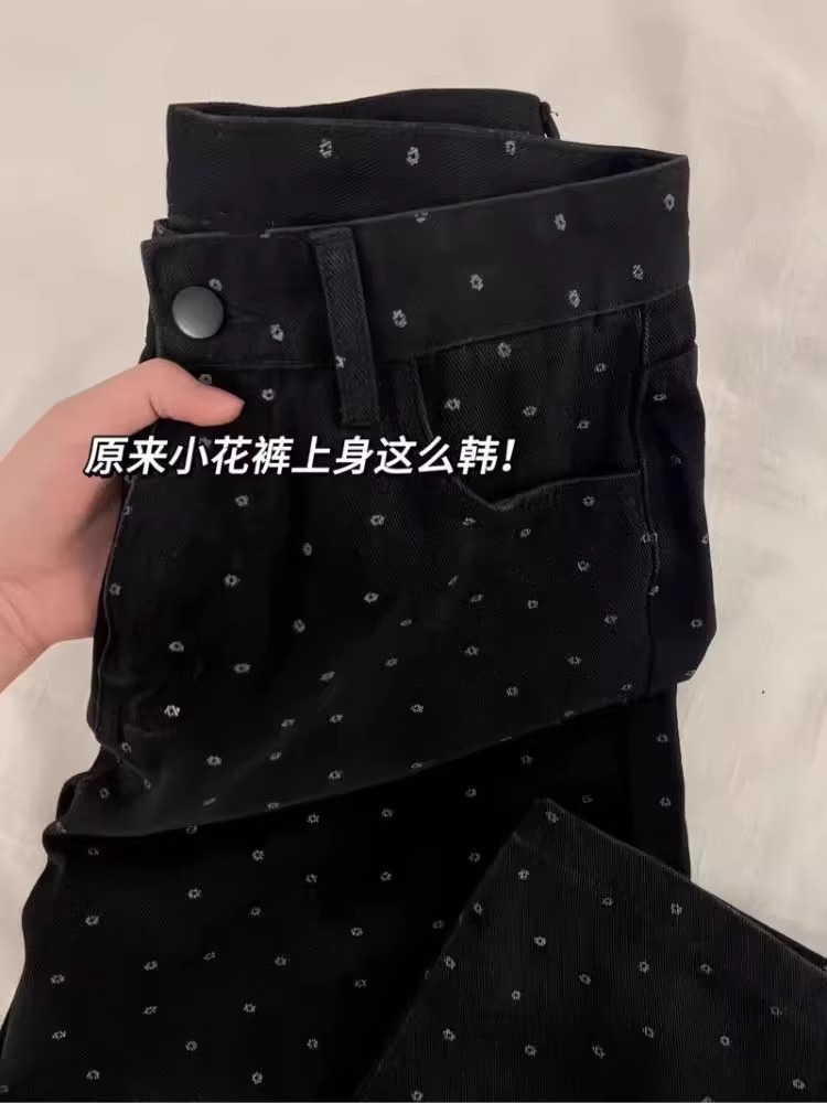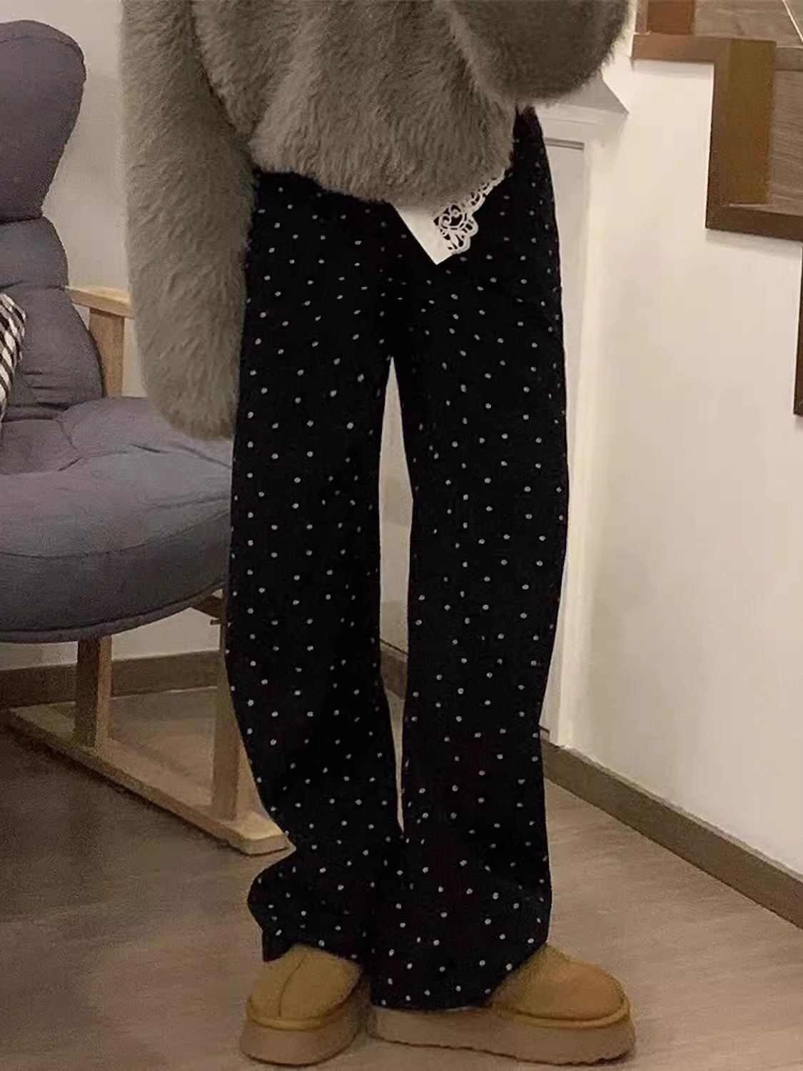 플러스 사이즈 미국 레트로 폴크 도트 스트레이트 청바지 여성 통통녀 봄과 가을 높은 허리 엉덩이 커버 슬리밍 꽃 넓은 다리 바지스토어 가기