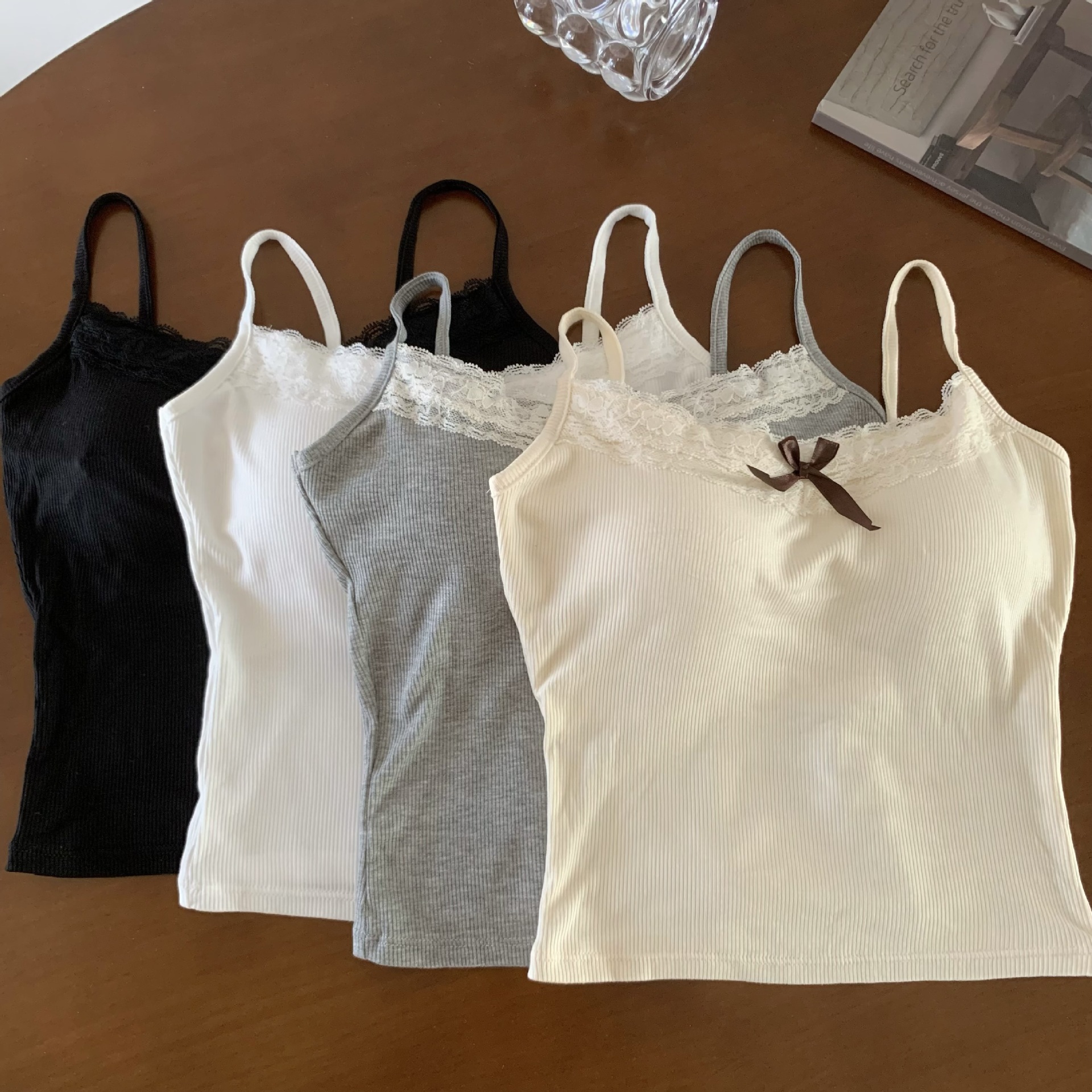 2024 봄 니트 작은 카미 솔 여성용 내베이스 레이스 소매 쇼트 탑 가슴 패드스토어 가기