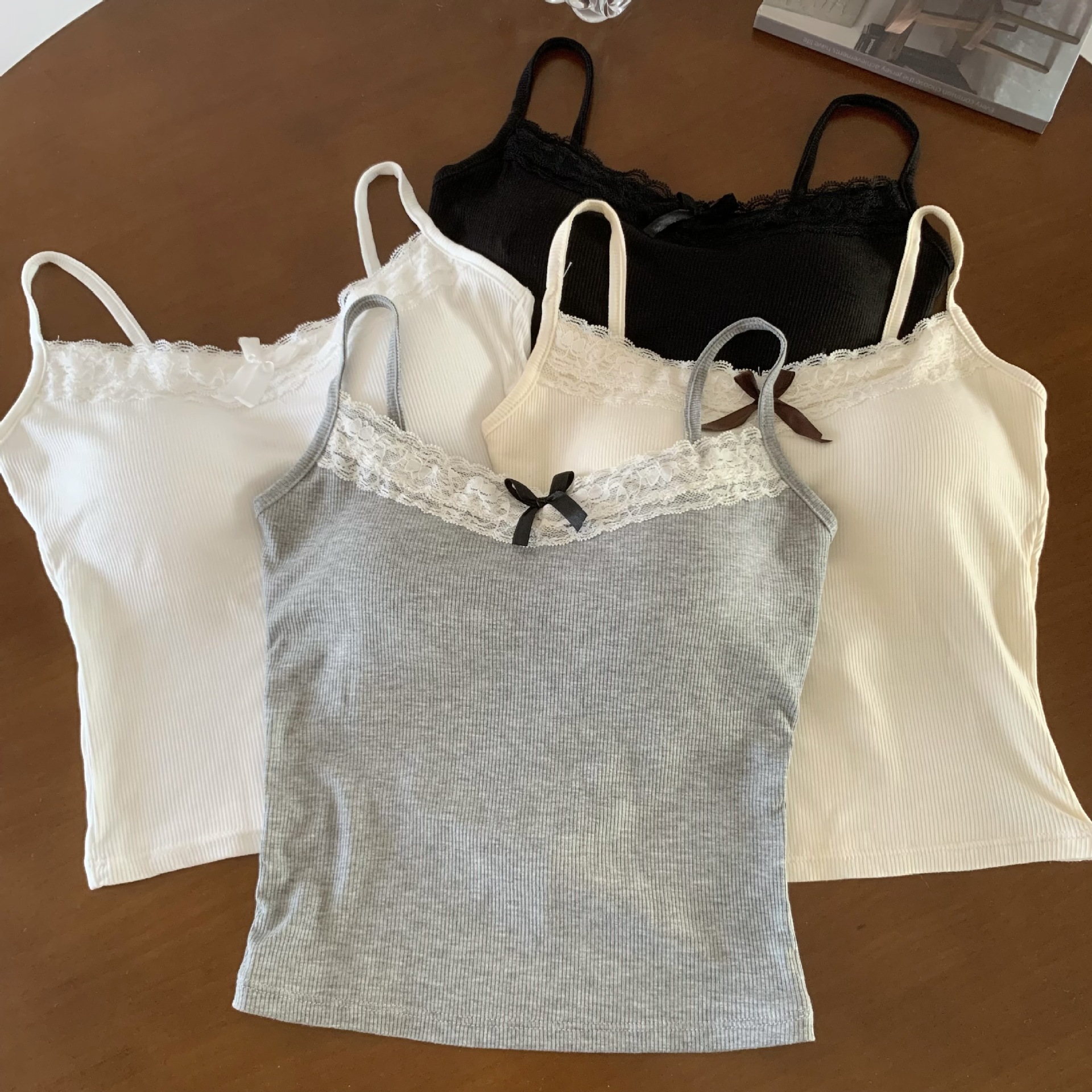 2024 봄 니트 작은 카미 솔 여성용 내베이스 레이스 소매 쇼트 탑 가슴 패드