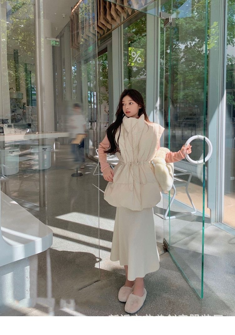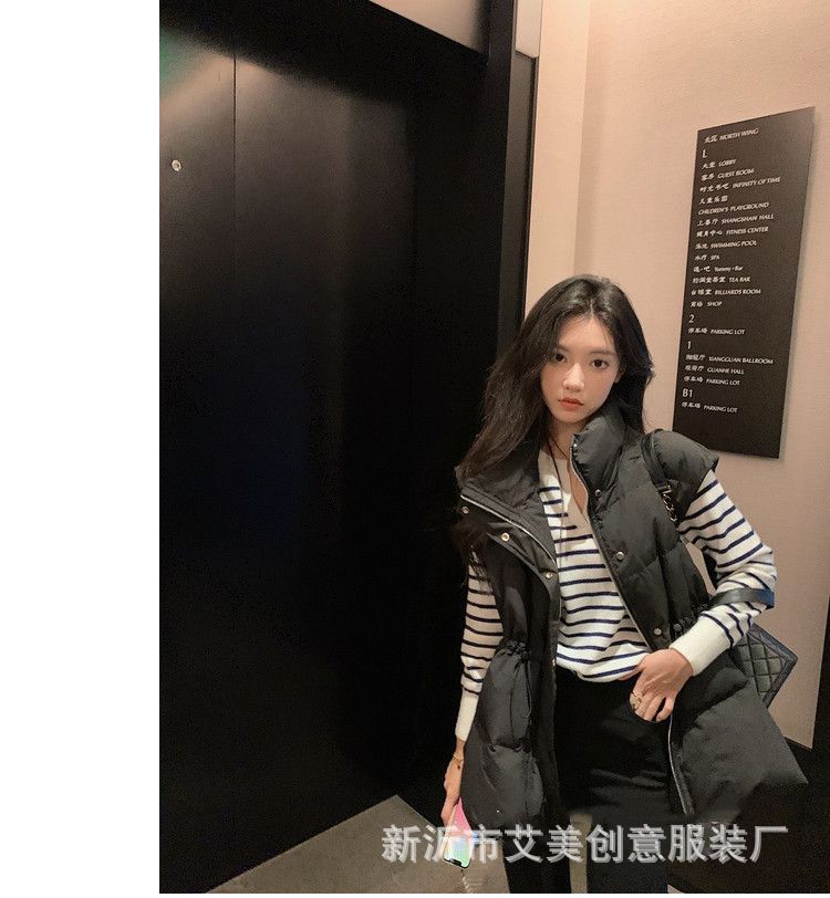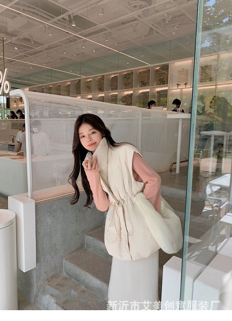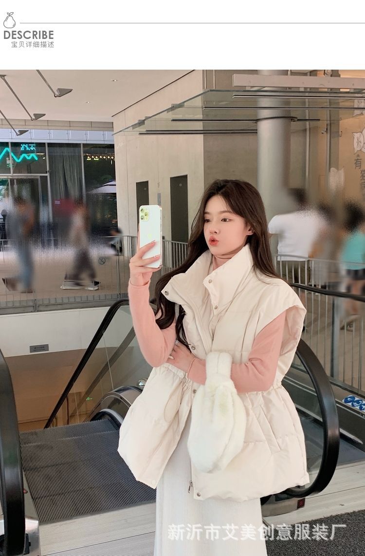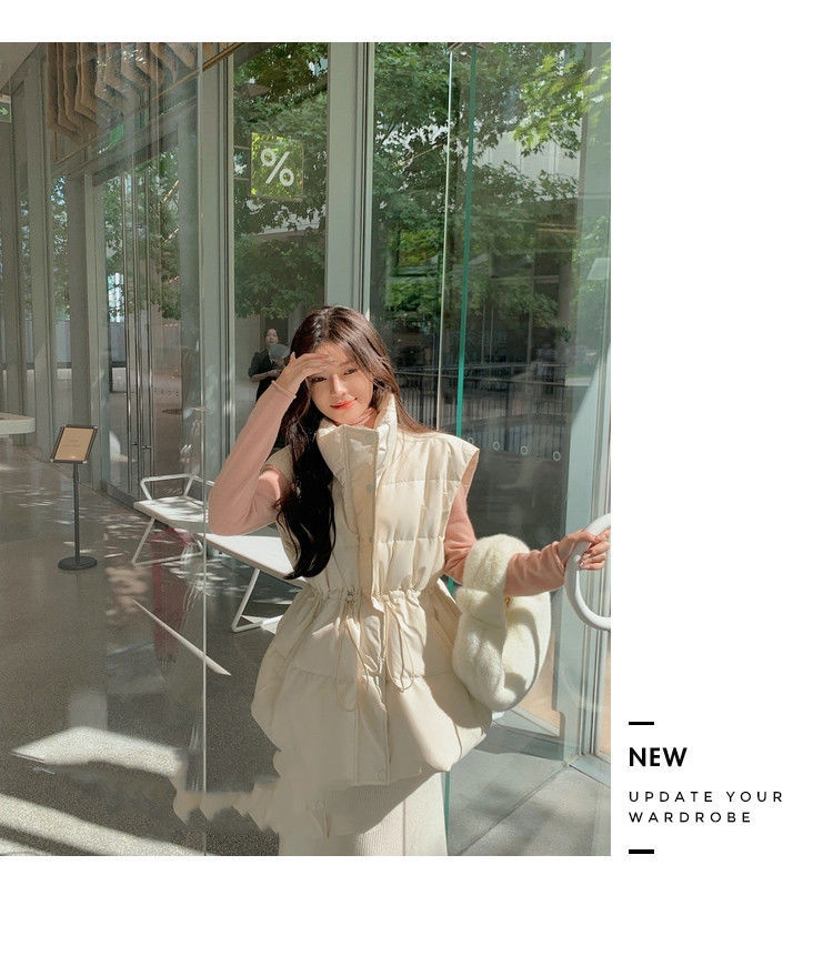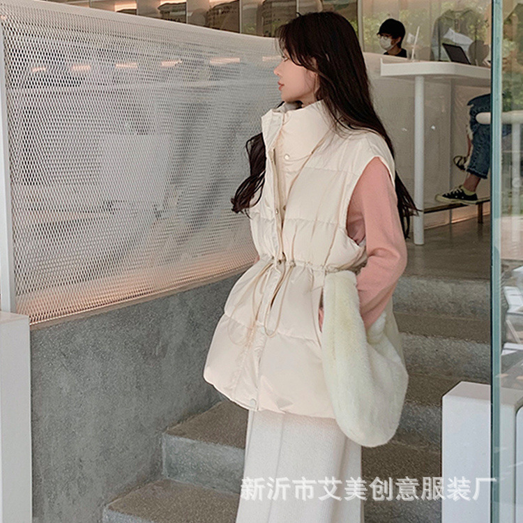 수직 칼라 민소매 조끼 다운 재킷 여성 주름 허리 슬리밍 올 매치 화이트 덕 다운 재킷 가을 및 겨울 새 재고스토어 가기