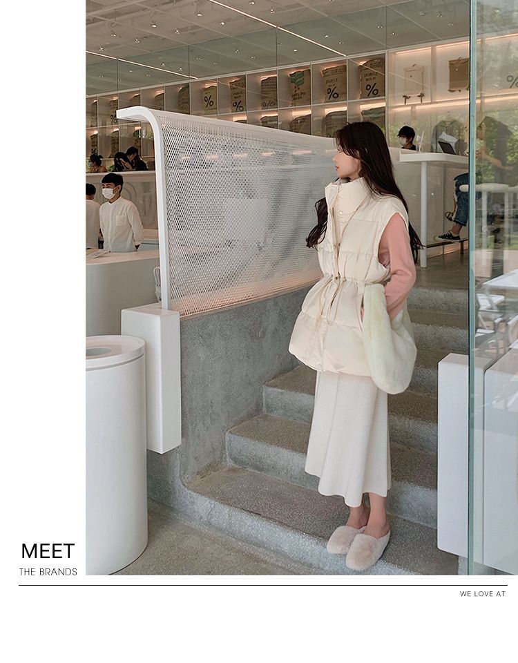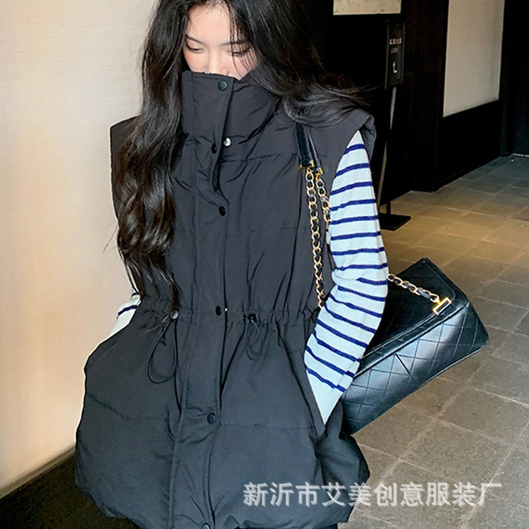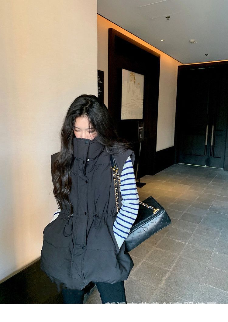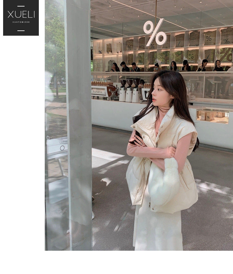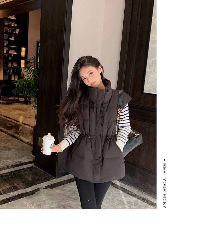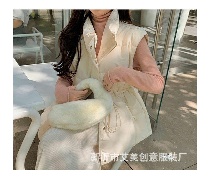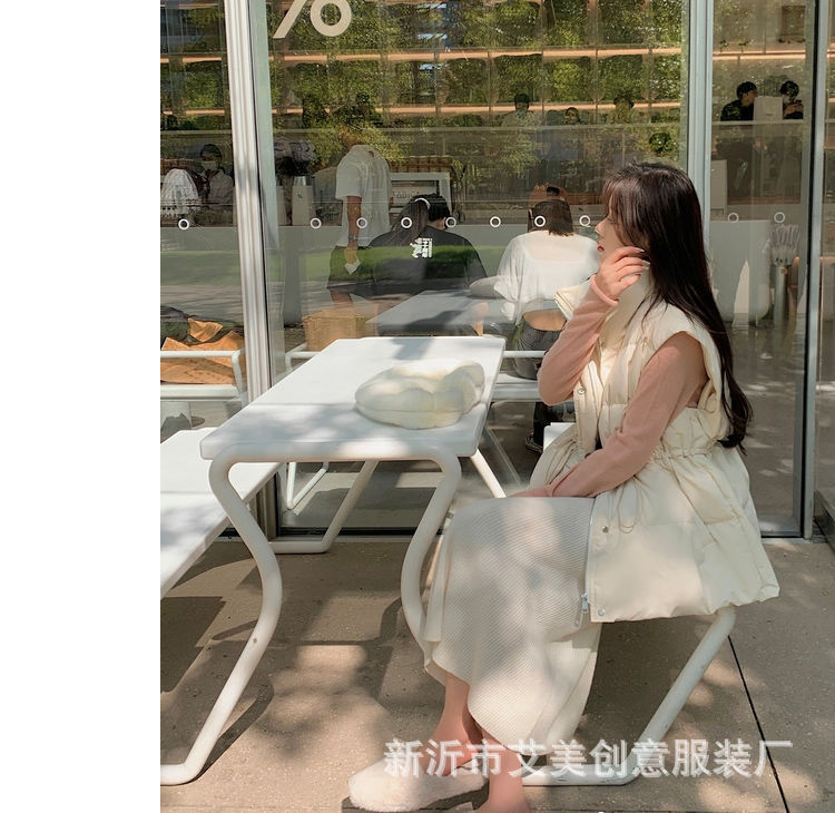 수직 칼라 민소매 조끼 다운 재킷 여성 주름 허리 슬리밍 올 매치 화이트 덕 다운 재킷 가을 및 겨울 새 재고스토어 가기