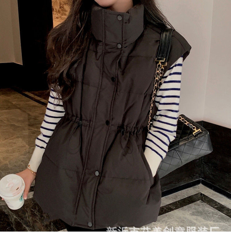 수직 칼라 민소매 조끼 다운 재킷 여성 주름 허리 슬리밍 올 매치 화이트 덕 다운 재킷 가을 및 겨울 새 재고