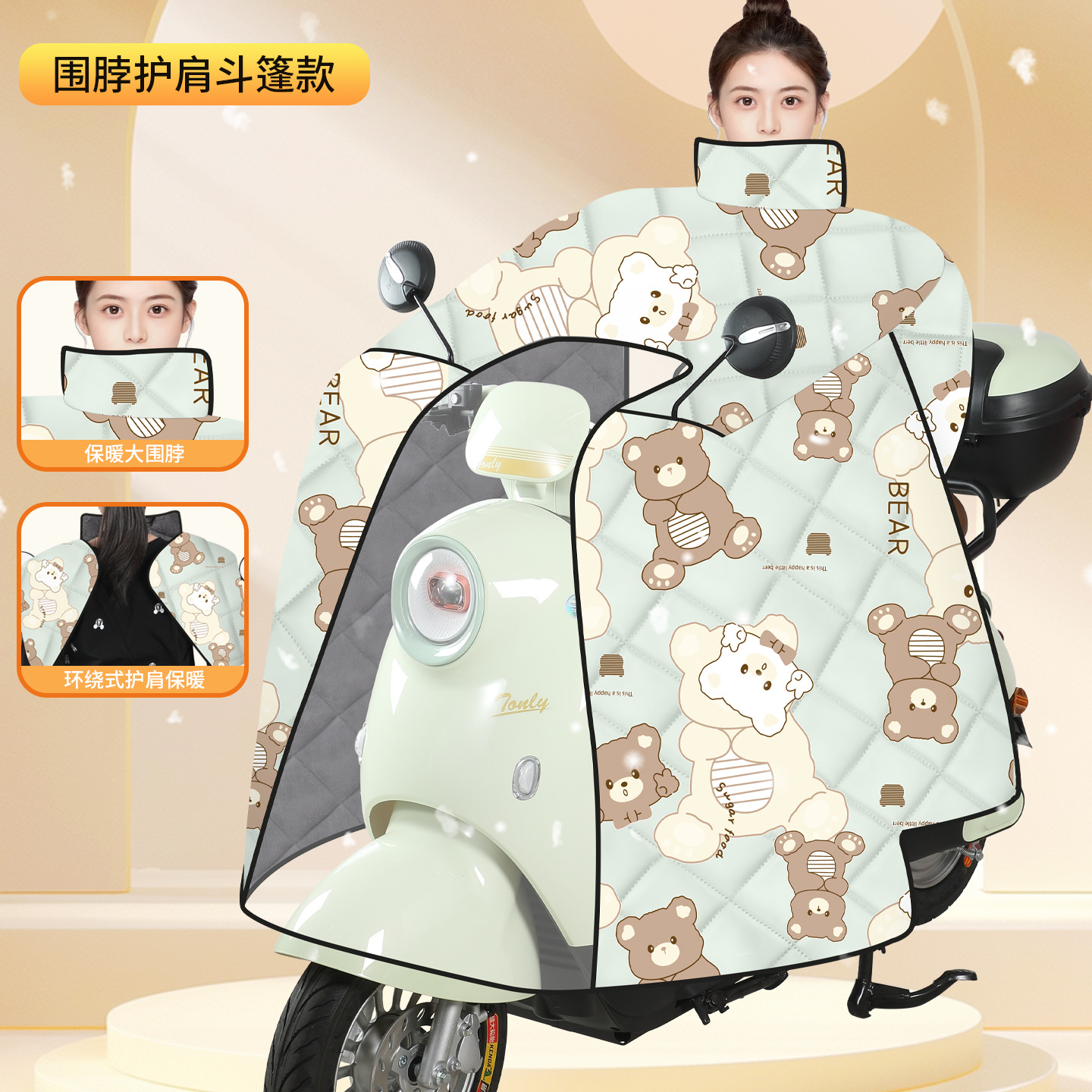 • 벨벳과 두꺼운 망토 + 스카프 + 어깨 패드 + 더블 포켓, 연두색 만화 곰
